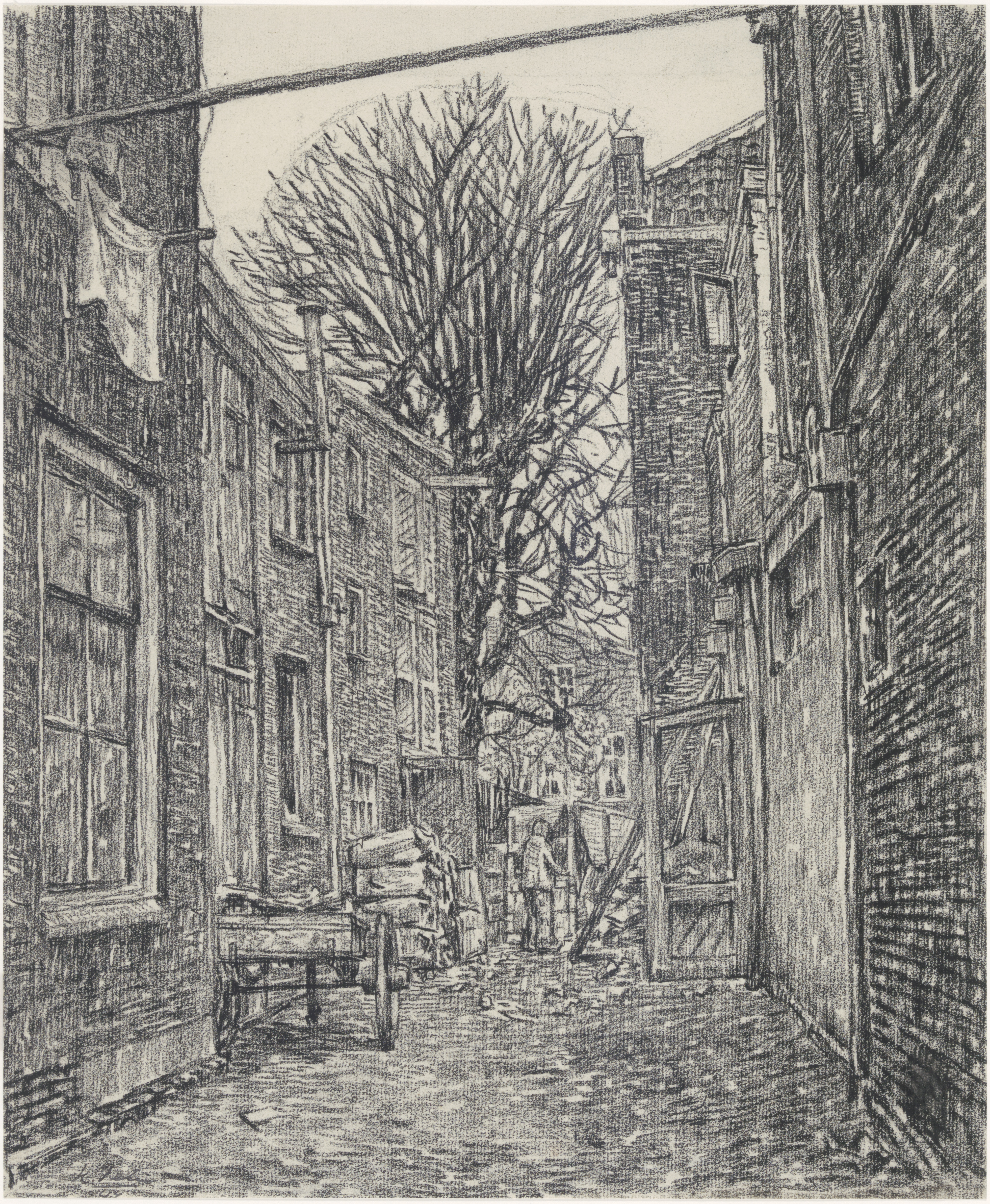 - Gezicht in de brandgang achter de huizen aan de noordzijde der Boogjes in oostelijke richting uit de Ruitenstraat.