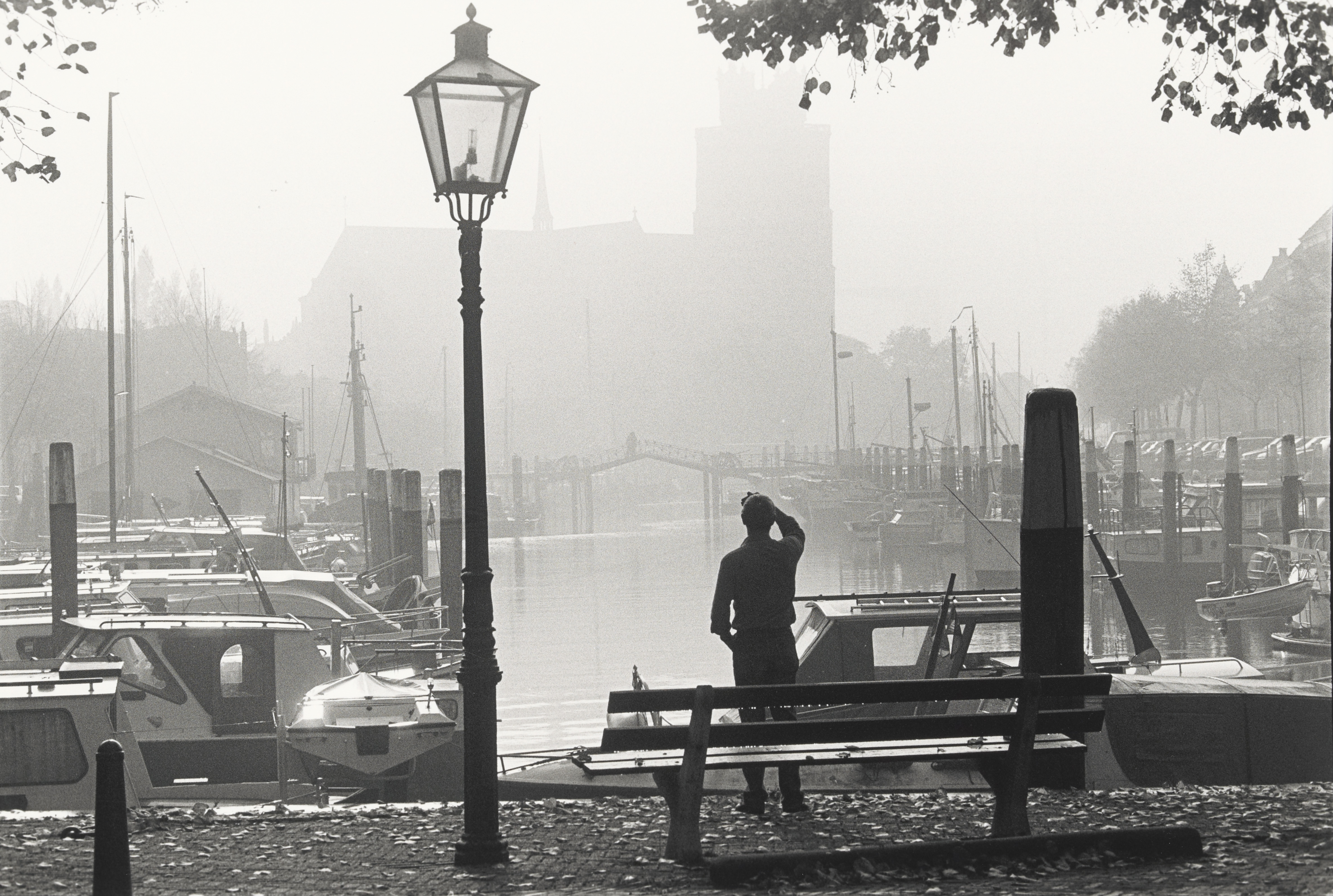 - botenhuizen bruggen dukdalven / meerpalen havens kerken lantaarns / straatverlichting mist pleziervaartuigen zitbanken