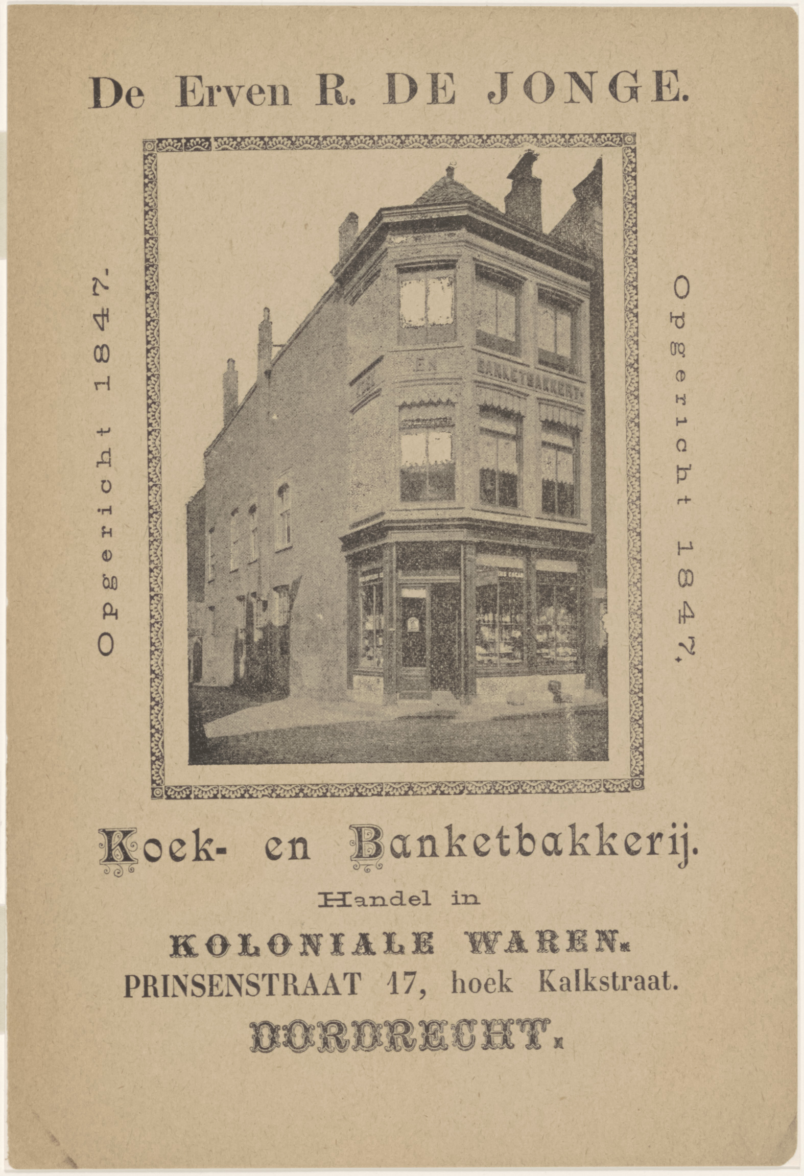 - Banketbakkerij der Erven R. de Jonge (Prinsenstraat, hoek Grote Kalkstraat Nz.).