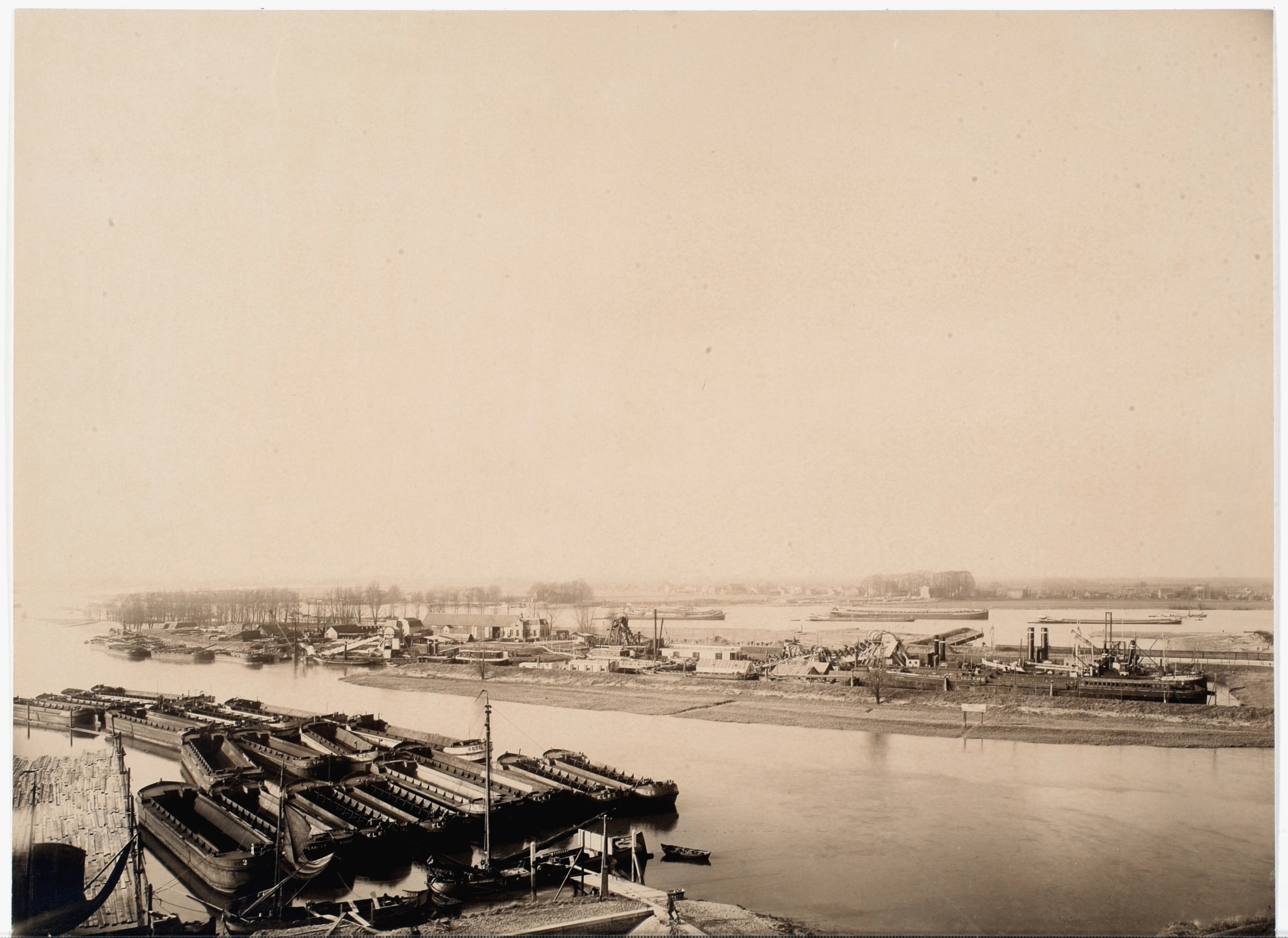 - De Staart naar het noordwesten met stoombaggerschepen. met vooraan het Wantij en de achterliggende rivier is de Merwede