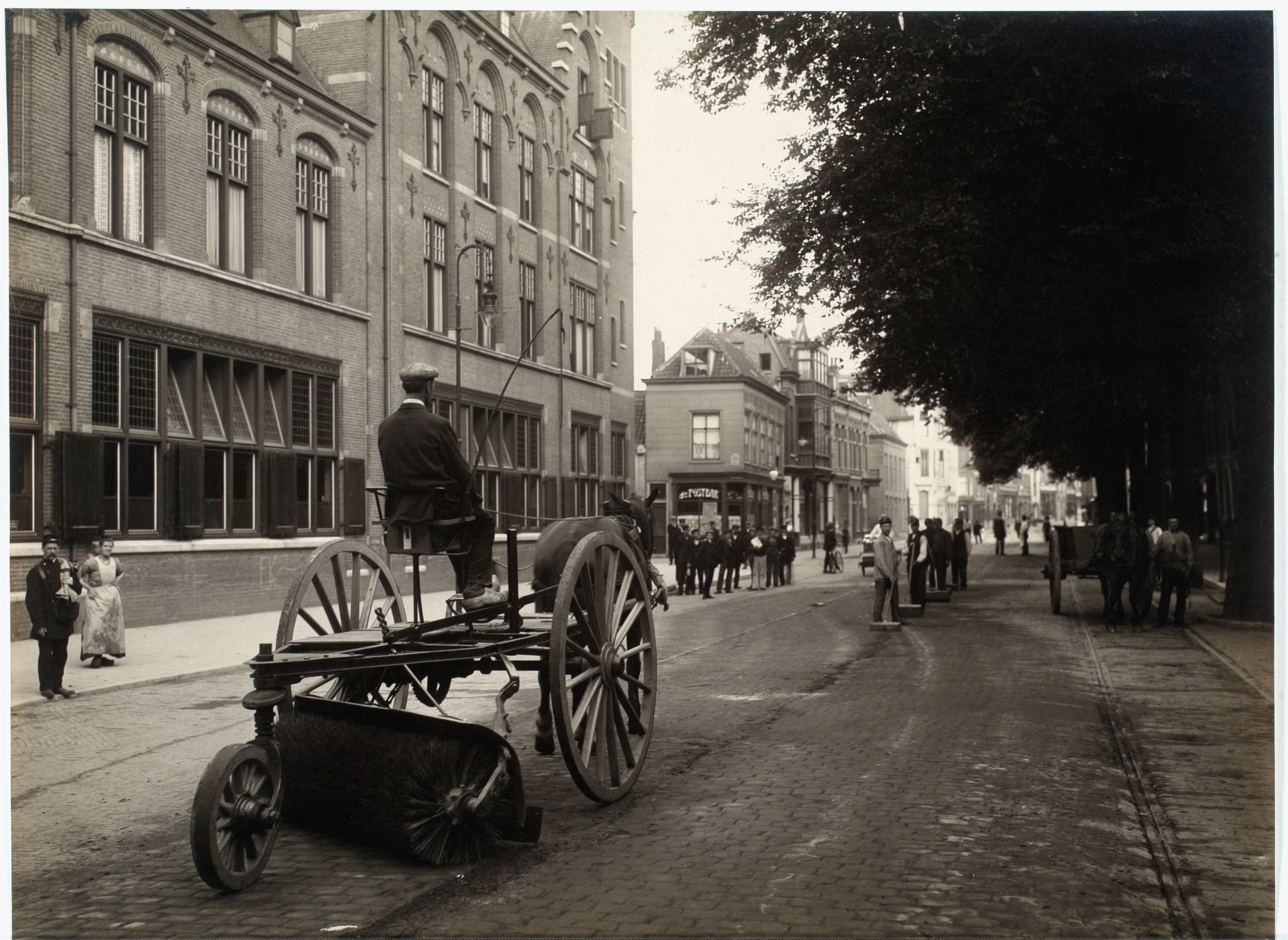 Bagijnhof richting Visstraat, veegmachine van de Gemeentelijke Reinigingsdienst ter …