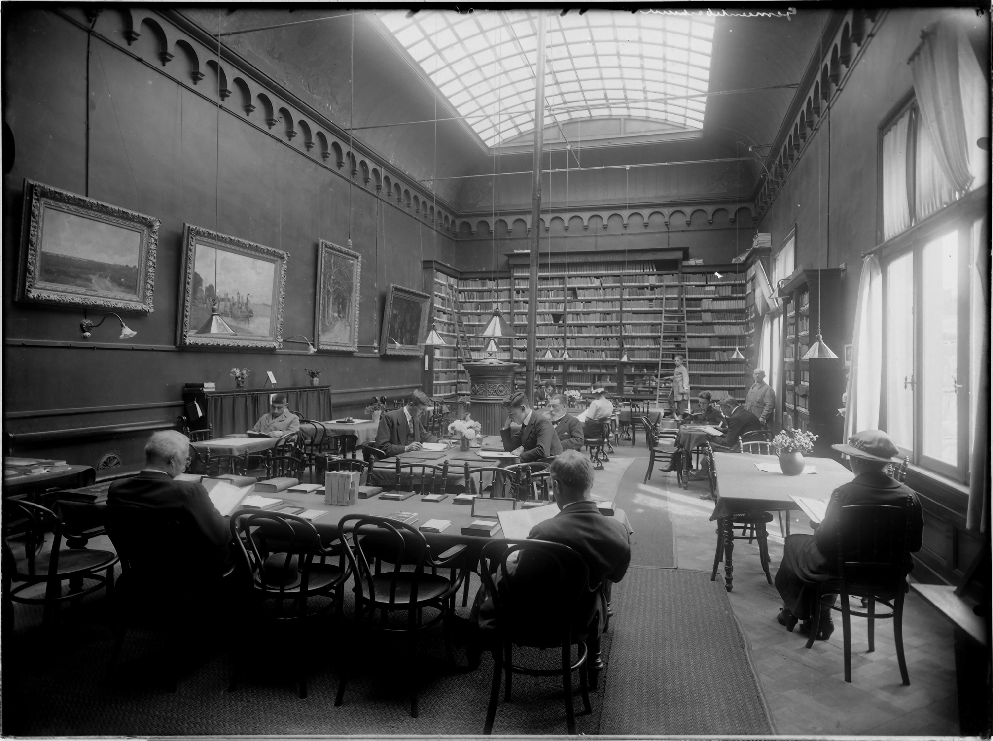 Interieur van de openbare bibliotheek en leeszaal in de Boterbeurs in de Wijnstraat