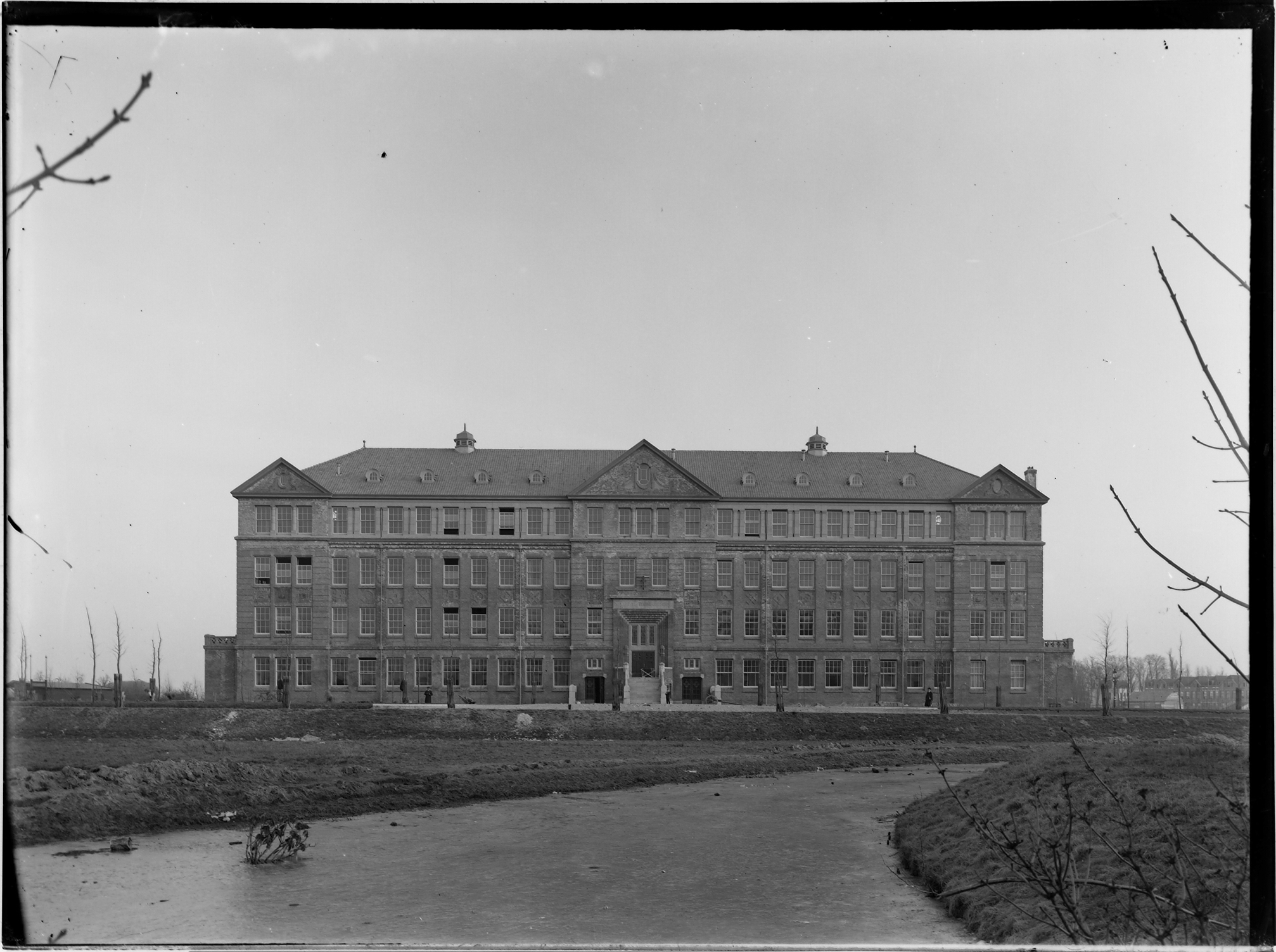 Gebouw van de HTS aan de Oranjelaan'op de voorgrond de bevroren singel bij de latere …