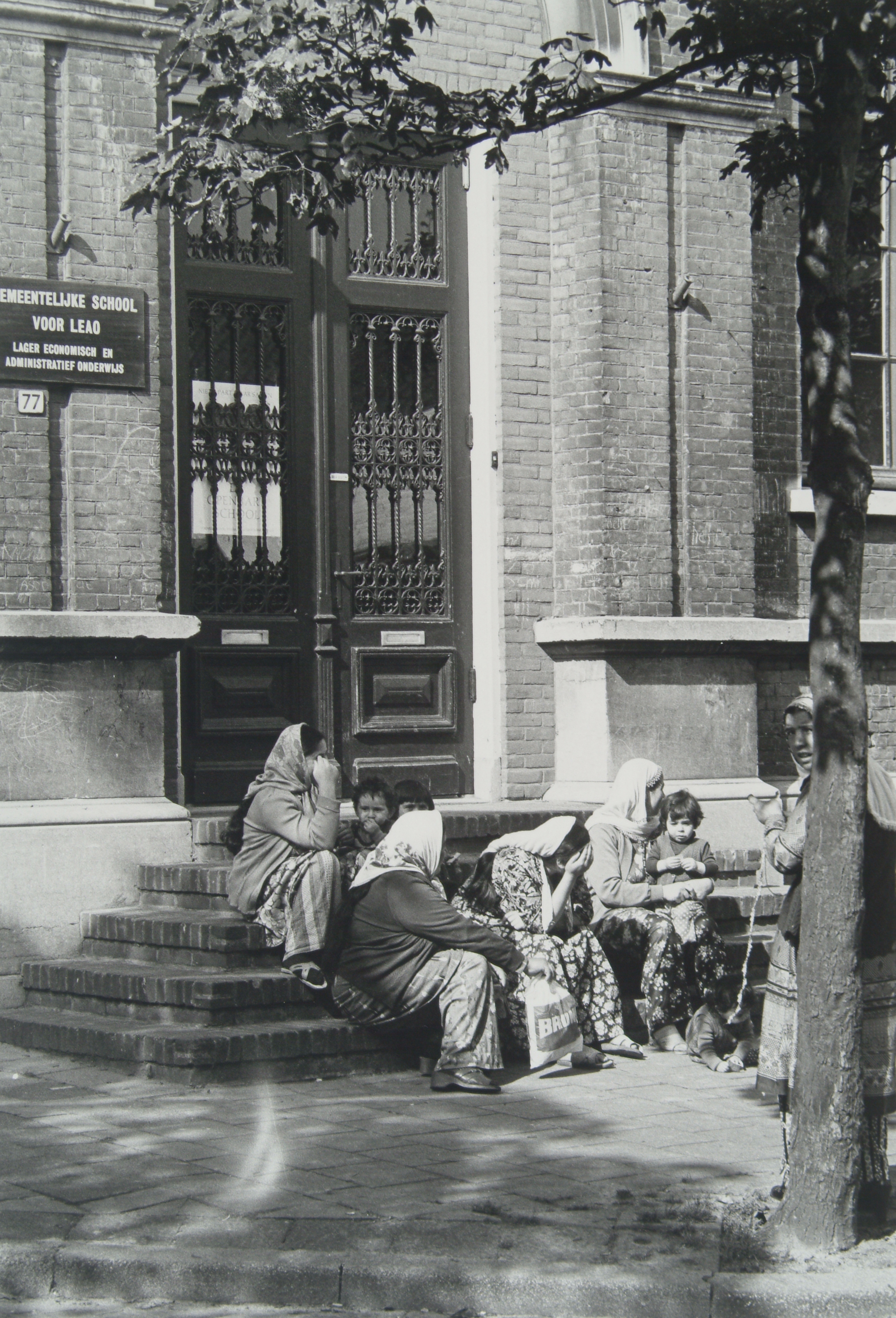Allochtone vrouwen en kinderen op de stoep van de gemeentelijke LEAO school aan het Kasperspad