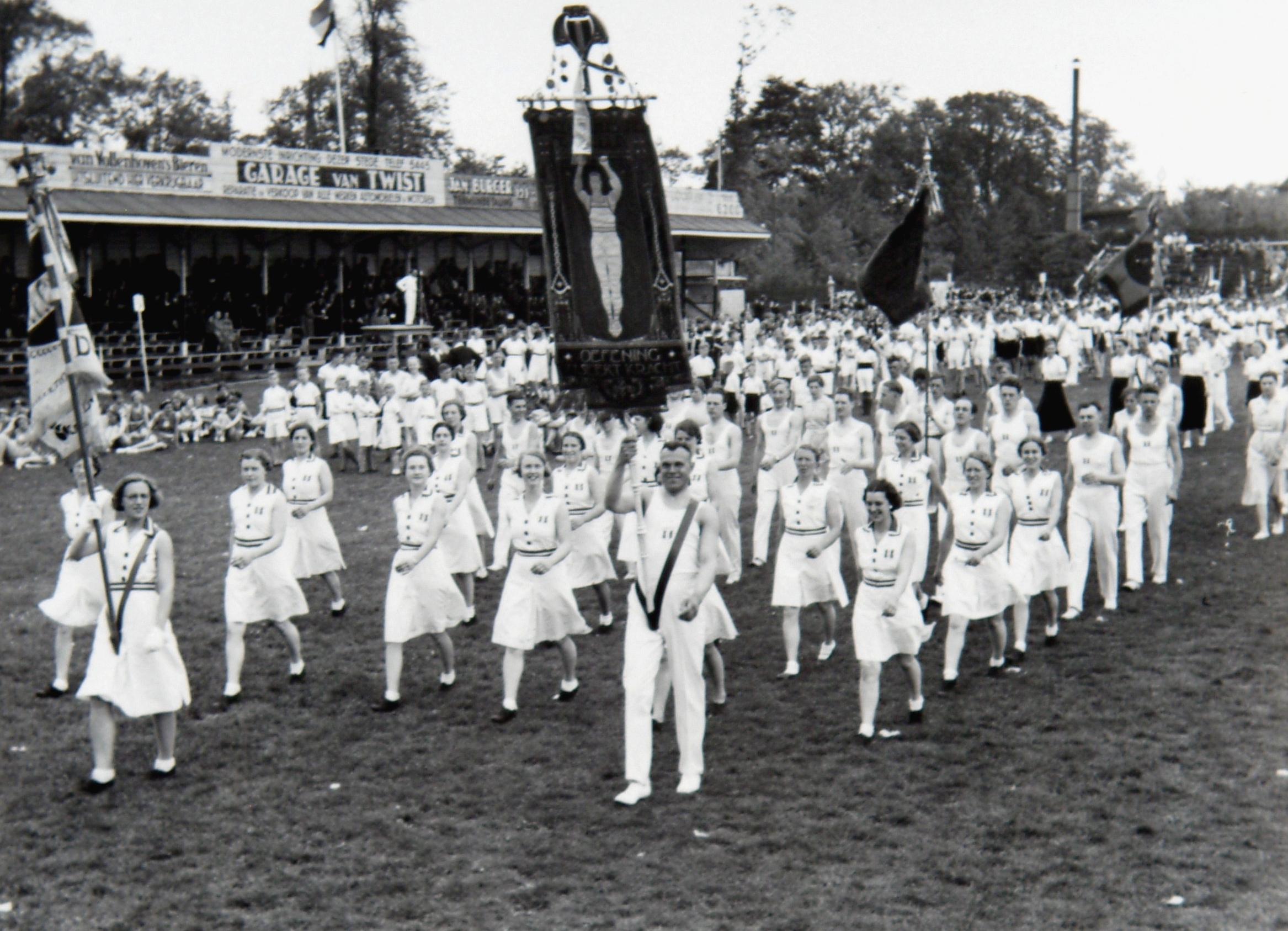 - gymnastiekverenigingen reclameborden sportterreinen tribunes vaandels