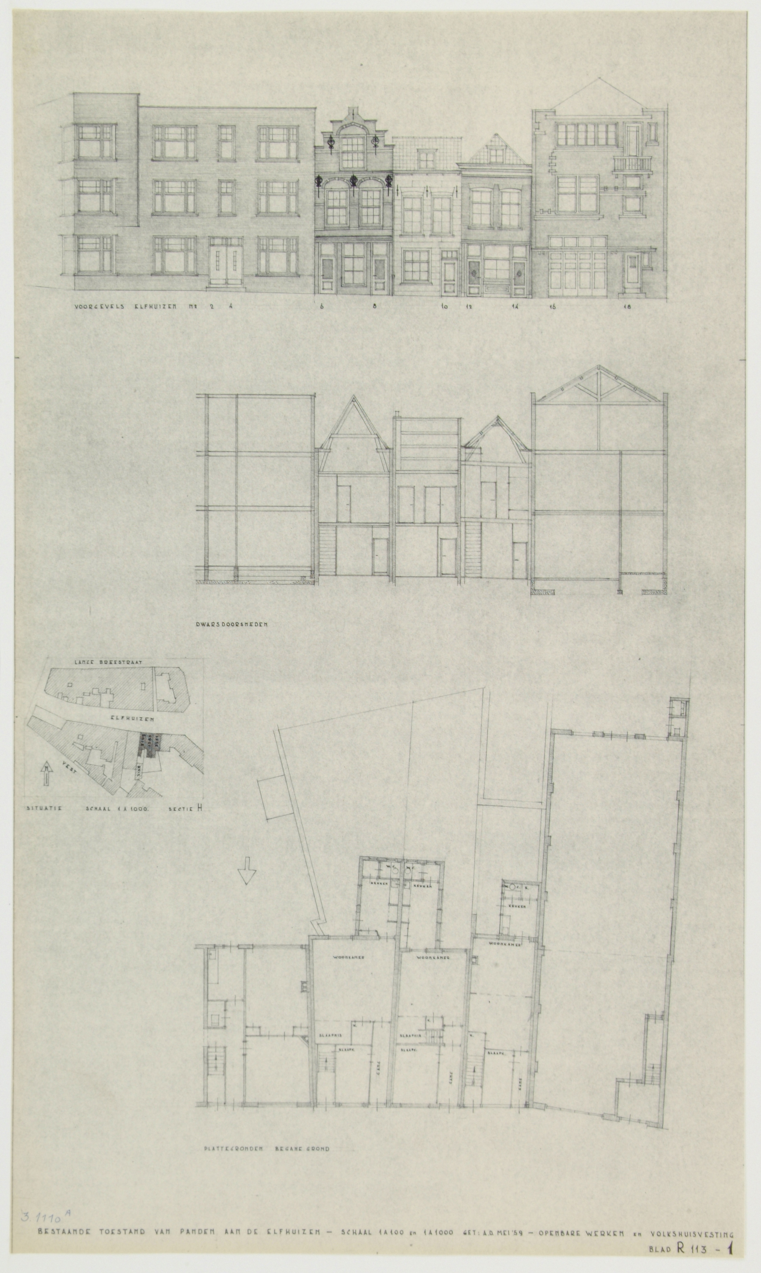 - Bouwtekening van de huizen Elfhuizen 2 - 18 (zuidzijde tegenover de Haringstraat).
