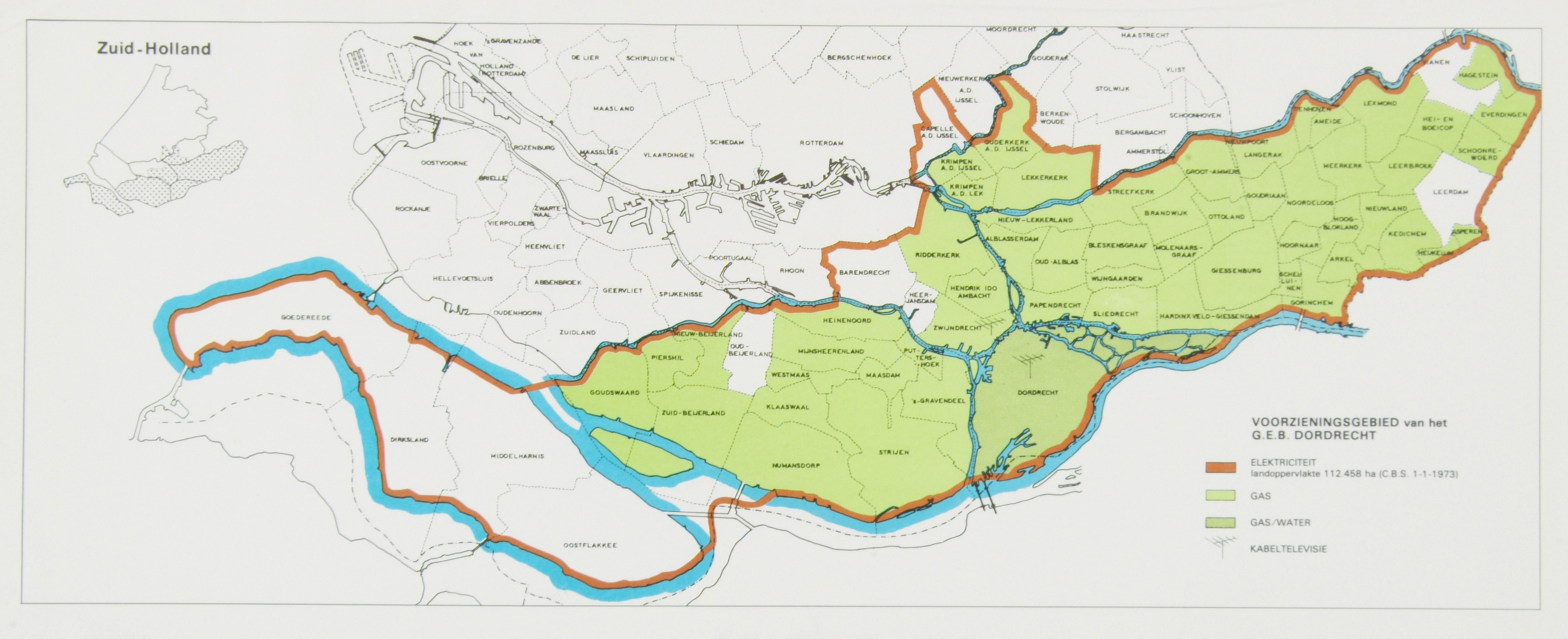 - Kaart van het voorzieningsgebied van het GEB, uitgesplitst in elektriciteit, gas, gas/water en kabeltelevisie.