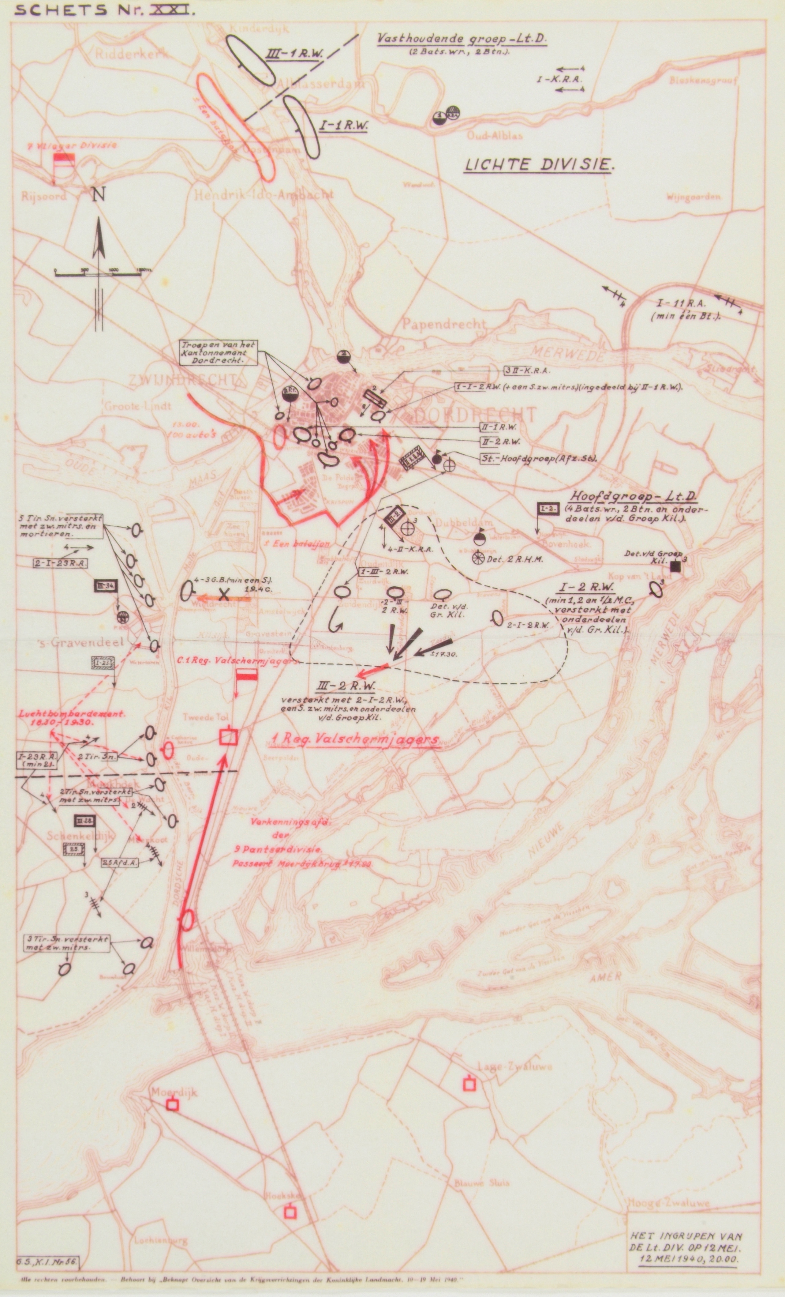 - Kaart van de oorlogshandelingen rond Dordrecht. Betreft 12 mei 1940, 20.00 uur.