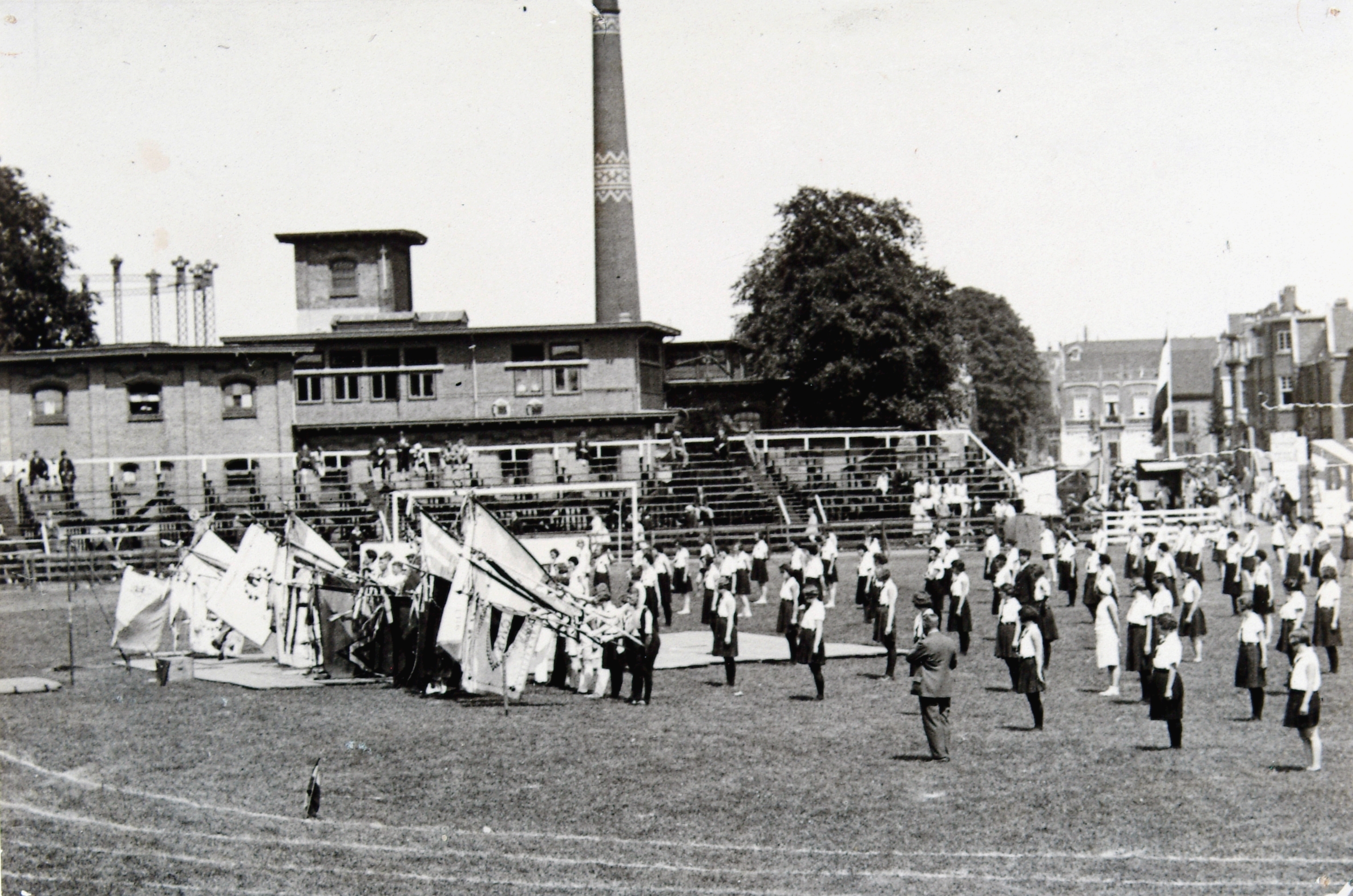 Turnfeest t.g.v. het 50-jarig bestaan van O.K.K. op het D.F.C.-terrein aan de Markettenweg. Naar het oosen gezien, met de schoorsteen van het abattoir en een gashouder. Rechts de Mauritsweg.