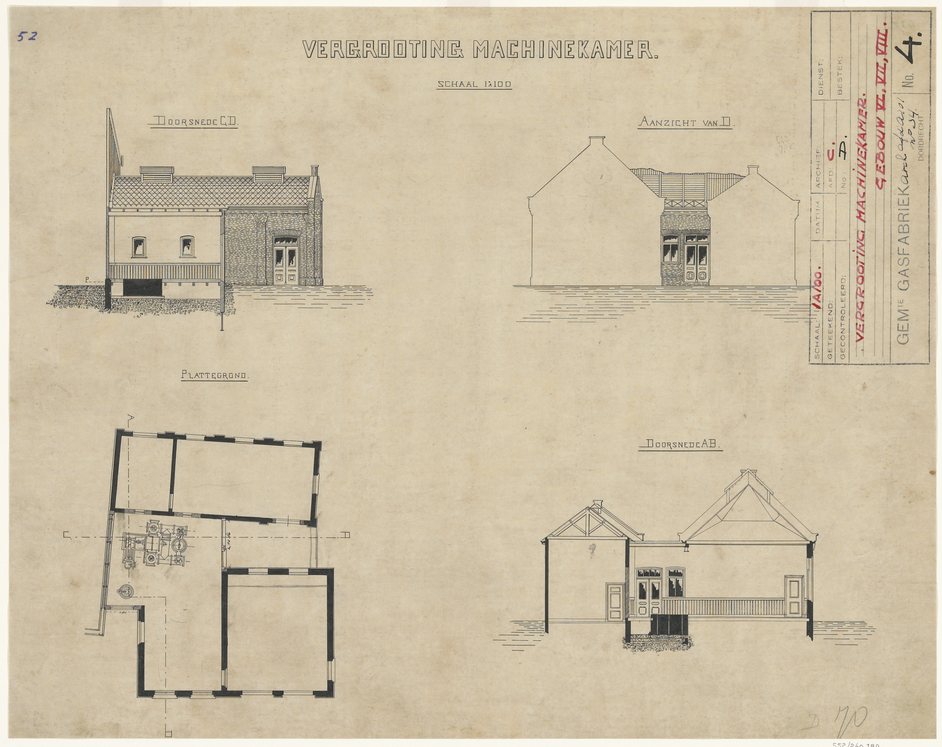 - Het ontwerp van de vergroting van de machinekamer van de gasfabriek aan de Merwekade.
