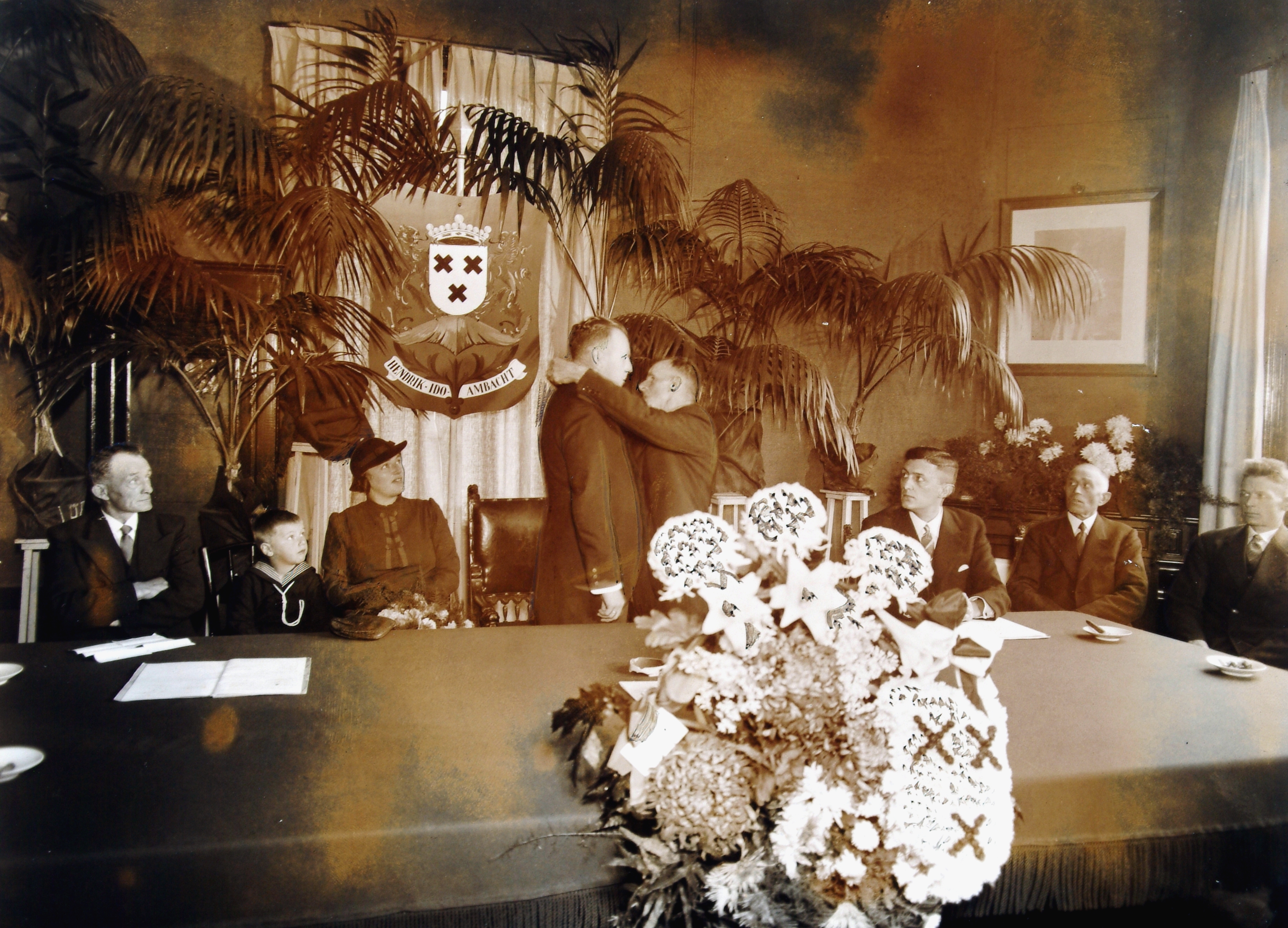 - Burgemeester Duiker van H.I. Ambacht krijgt de ambtsketen omgehangen door wethouder Van den Berg.