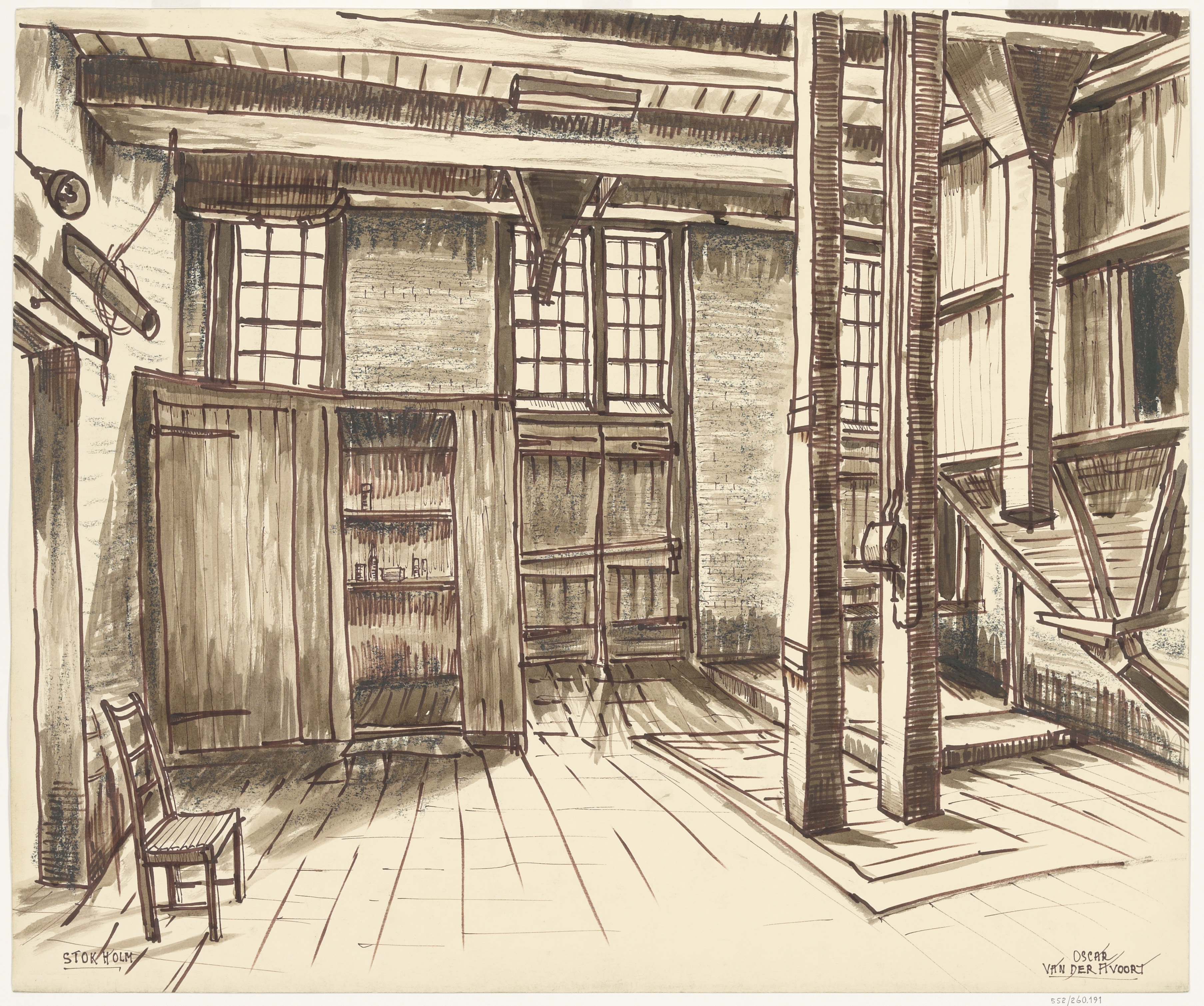 - Het interieur van het pakhuis Stokholm aan de Wolwevershaven, toen dat werd gebruikt als atelier door Amerikaanse en andere beeldende kunstenaars.