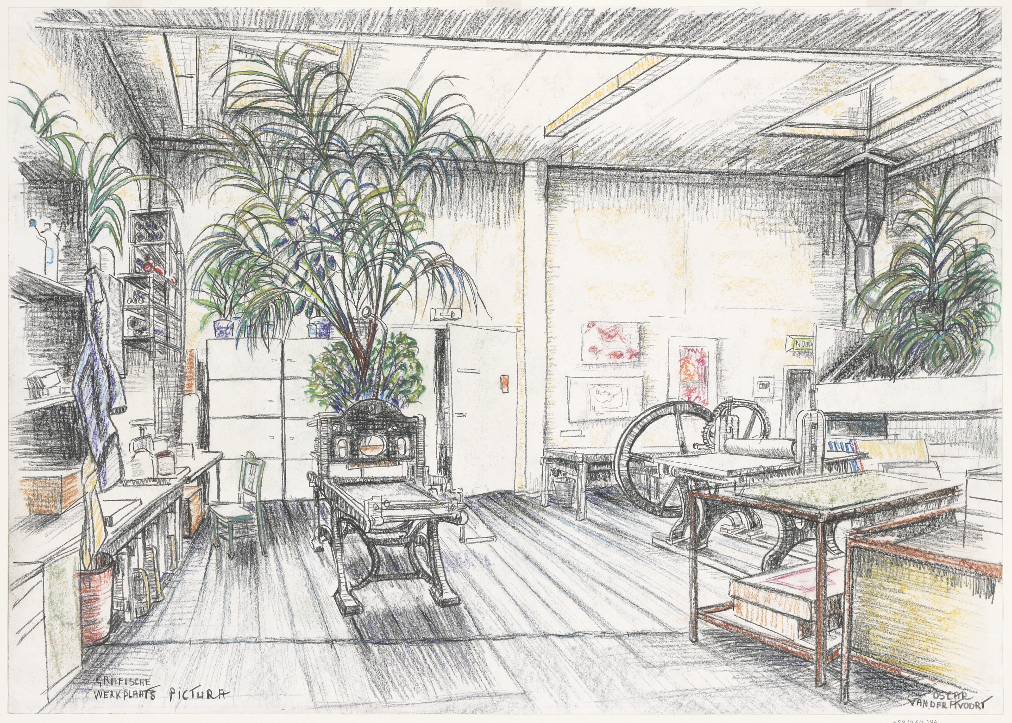 De grafische werkplaats van Teekengenootschap Pictura aan de Voorstraat.