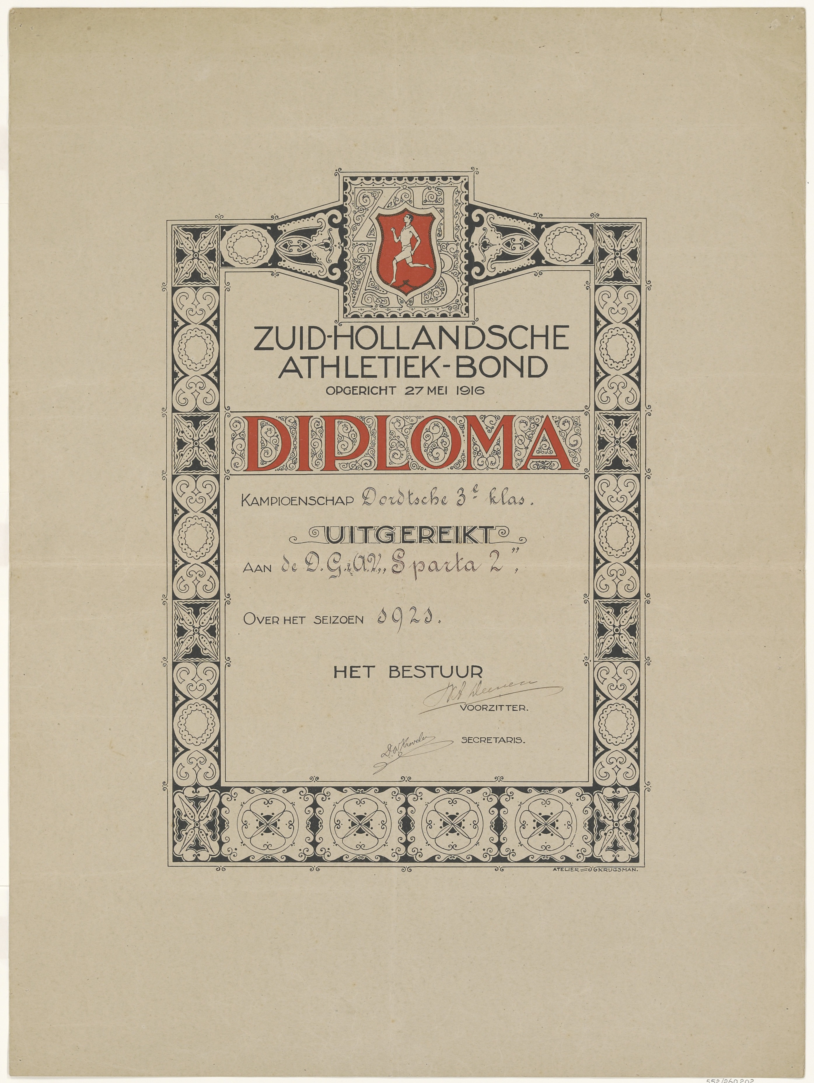 - Het diploma uitgereikt aan D.G.A.V. Sparta 2 door de Zuid-Hollandsche Athletiek-Bond t.g.v. het kampioenschap Dordtsche 3e klas, over het seizoen 1921.