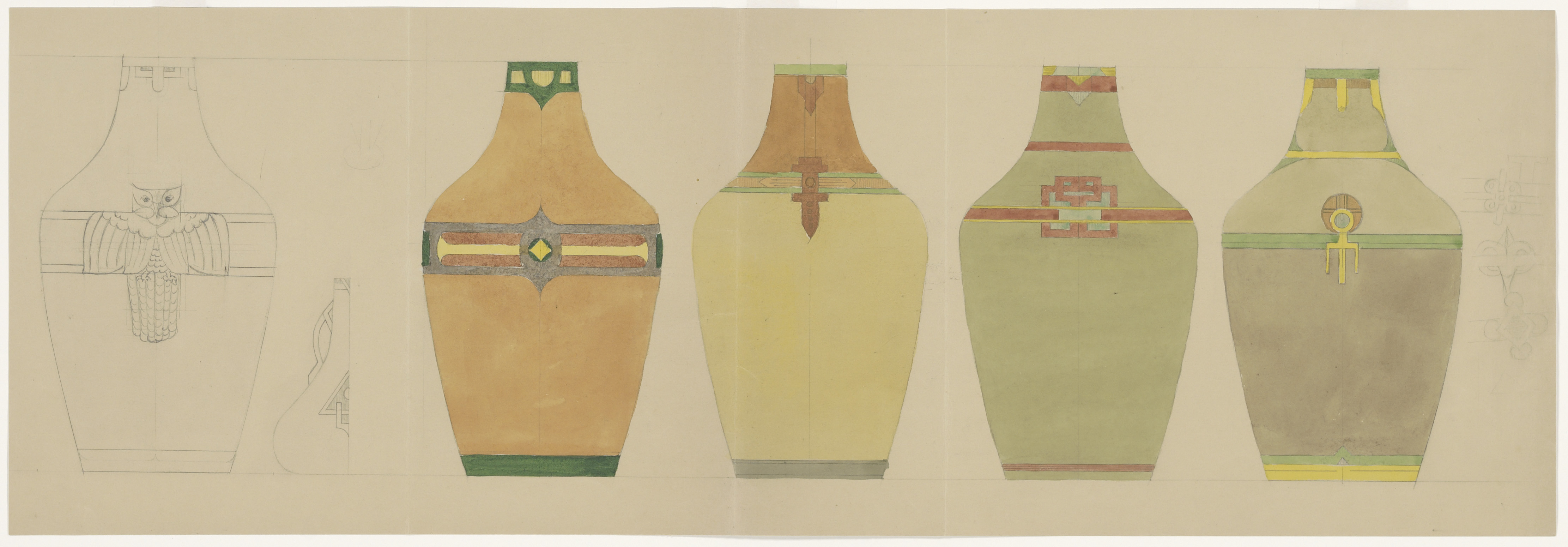 - 5 ontwerpen van een vaas van de Dordtsche Kunstpotterij.
