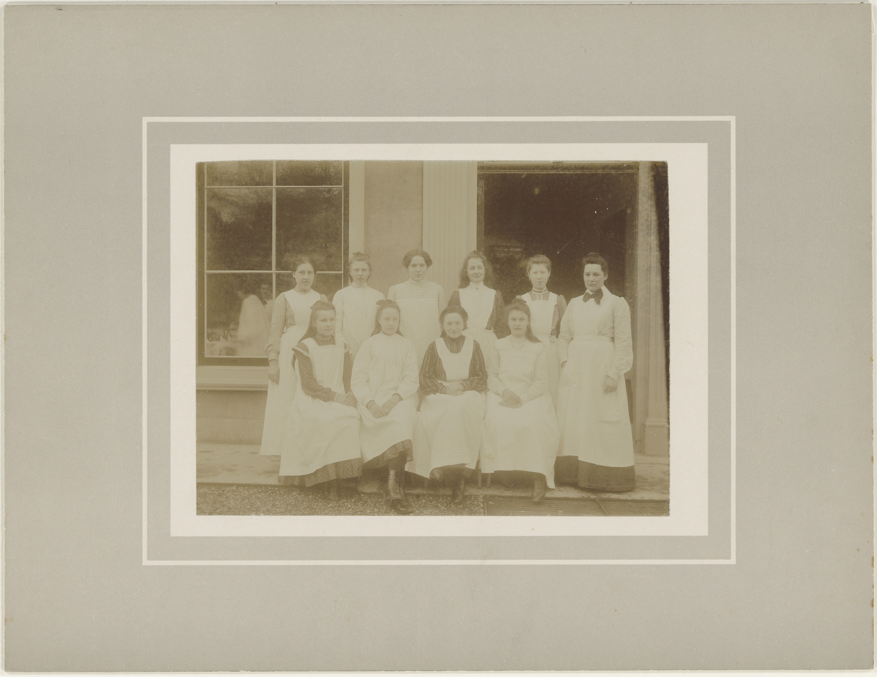 Groepsportret van leerlingen uit de Huishoudklas A van Industrie- en Huishoudschool Doelesteyn aan het Steegoversloot voor de ingang van de school met lerares.