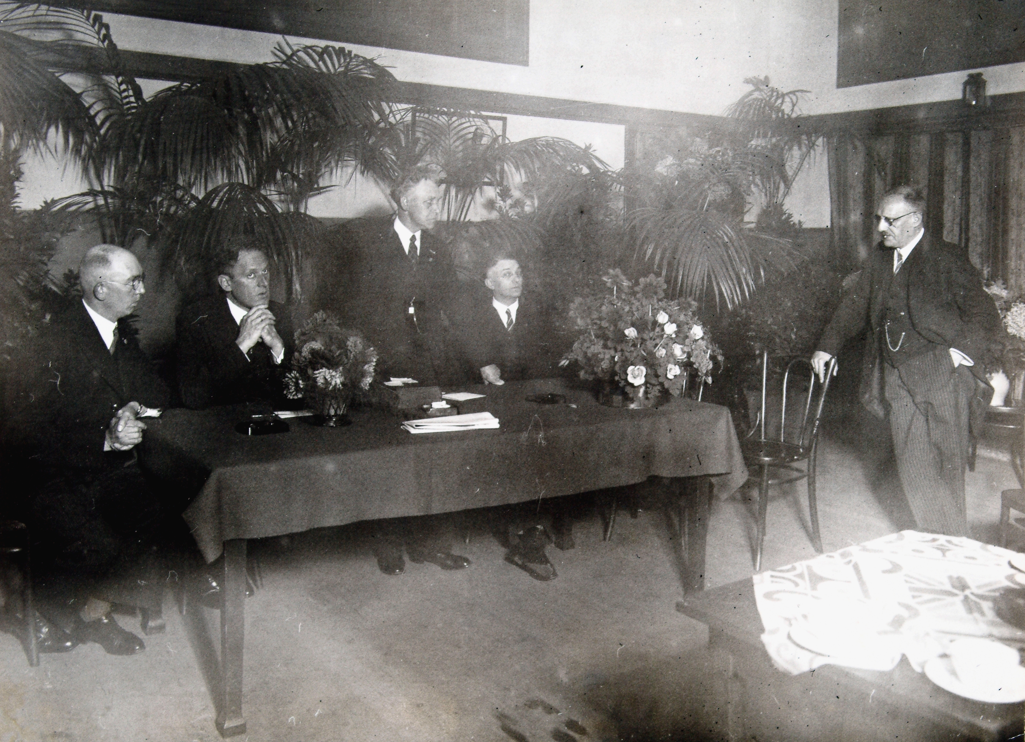 - Bestuur van C.J.M.V. "Eben Haëzer" recipieert bij het 75-jarig bestaan. Wethouder Dicke complimenteert namens het gemeentebestuur. Vanaf rechts: C.M. Dicke, A.G.A. v.d. Made, A.J. Scheurkogel, Th. Pols en T. Kerkhof.