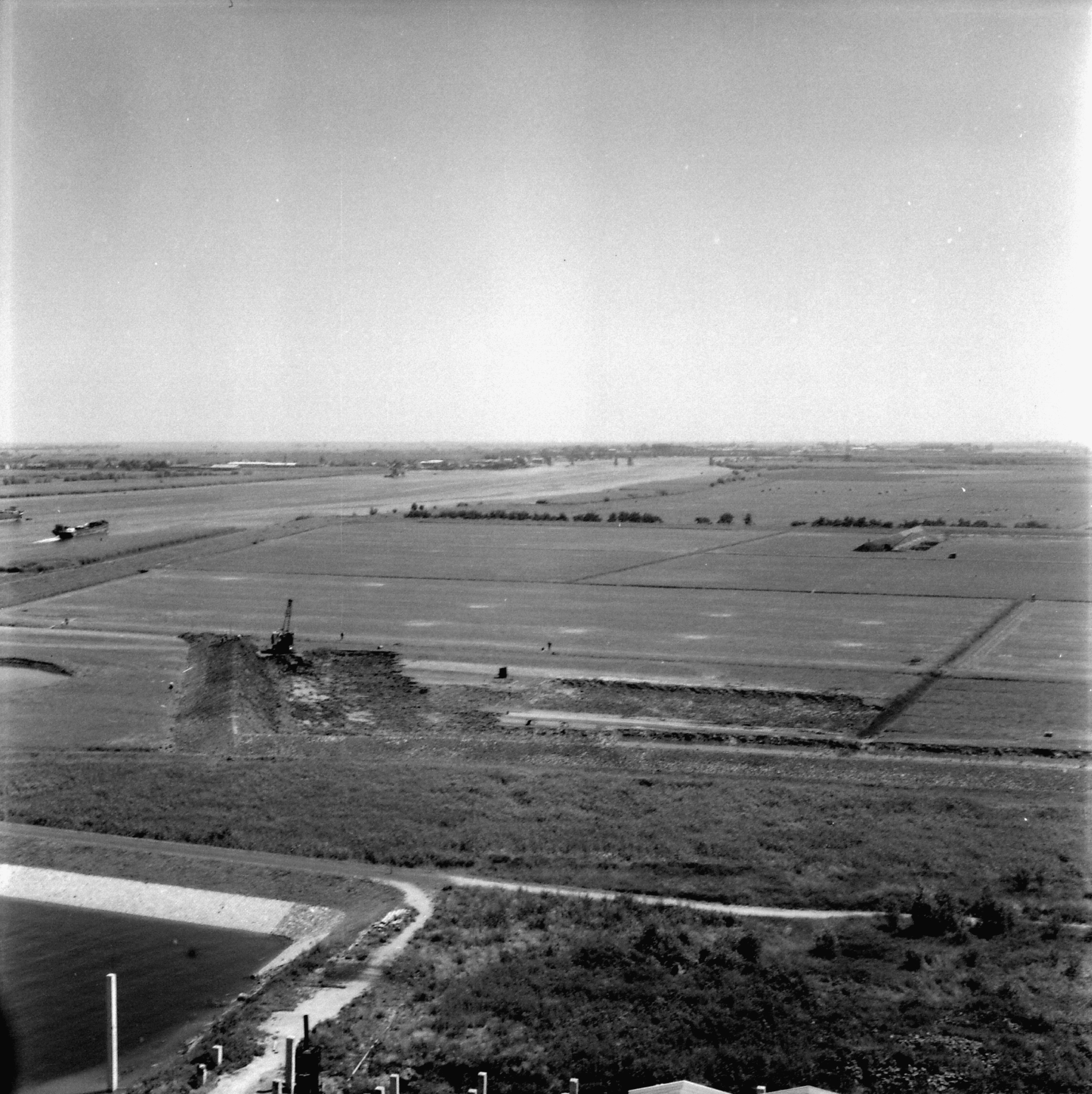 In de verte de Baanhoekspoorbrug die in 1983 werd vervangen door een nieuwe. De heipalen op de voorgrond dragen de koelwaterafvoerleiding van de centrale. Anno 2016 bestaat de leiding nog, hoewel buiten gebruik want de stroomfabriek is er al lang niet meer. Links de kolenhaven.
