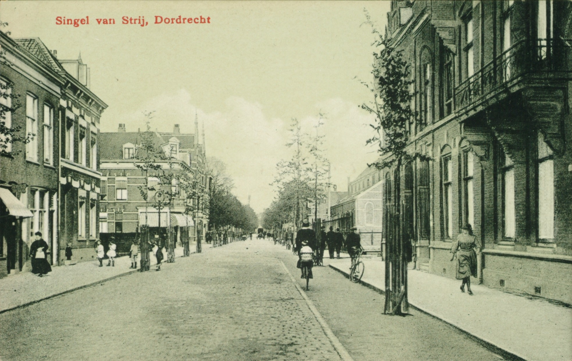 - De Van Strijsingel vanaf de Hoogt richting Spuiweg. De R.K. kerk (rechtsmidden) staat op de hoek van de Koninginnestraat.