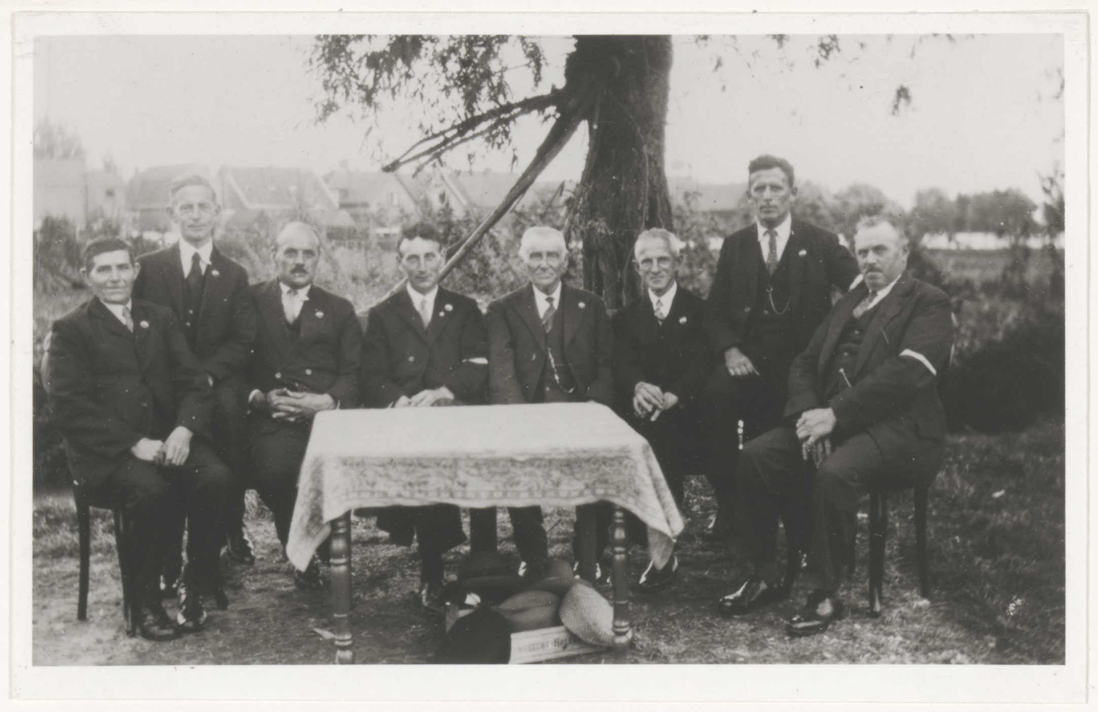 Groepsportret van het bestuur van de eerste Dubbeldamse buurtvereniging Kromme Zandweg: 8 mannen gezeten achter een tafeltje onder een boom, hun petten en hoeden in een veiligheidskratje onder de tafel. V.l.n.r. C.P. van Nes, hr. Waltmann, hr. Van Zomeren, Hannes Kooij, Walt van der Giessen, hr. Bosman, hr. De Wit, Leen van Heeren.