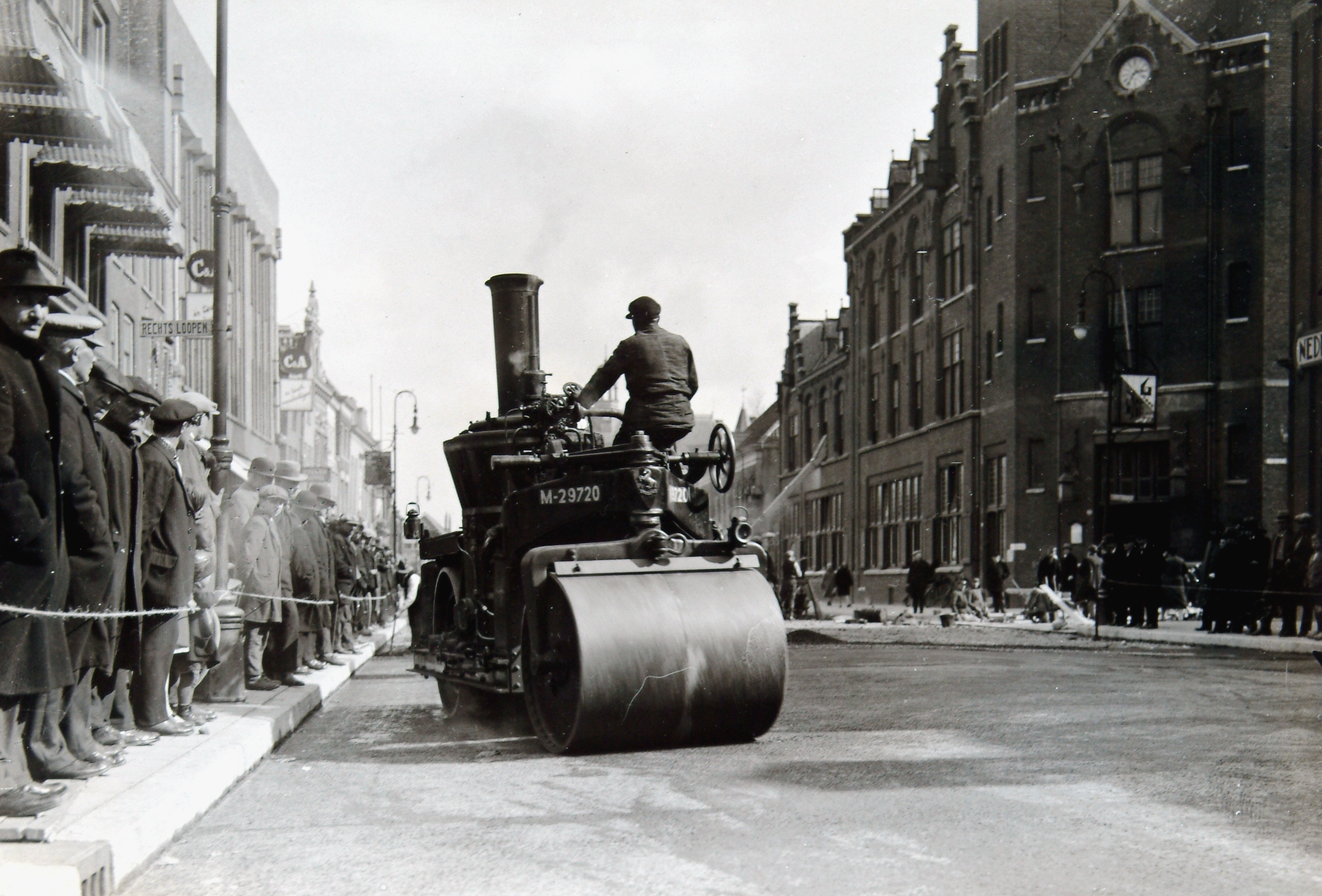 - Toeschouwers bij het asfalteren van het Bagijnhof. Rechts het postkantoor.