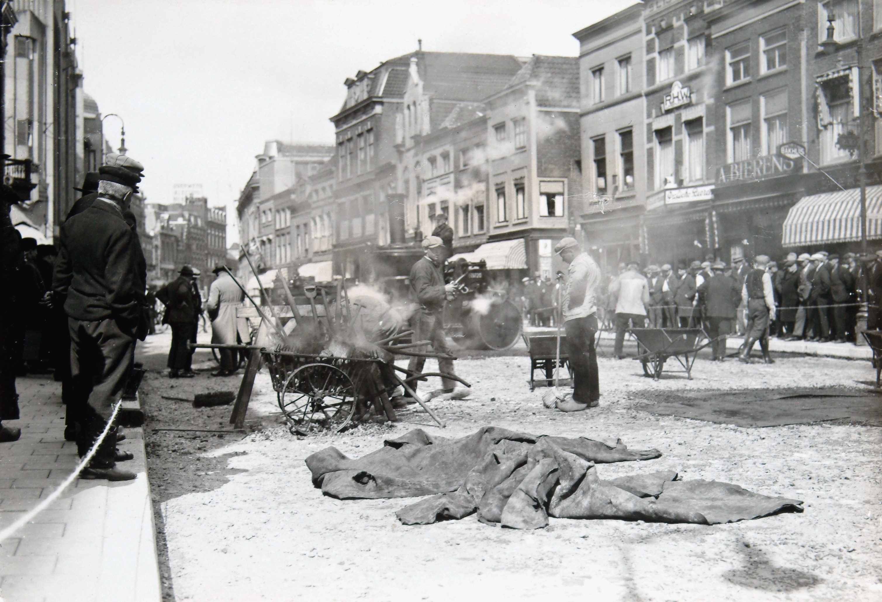 - Gezicht op het Bagijnhof, tussen de Raamstraat en het Achterom, tijdens asfalteerwerkzaamheden.