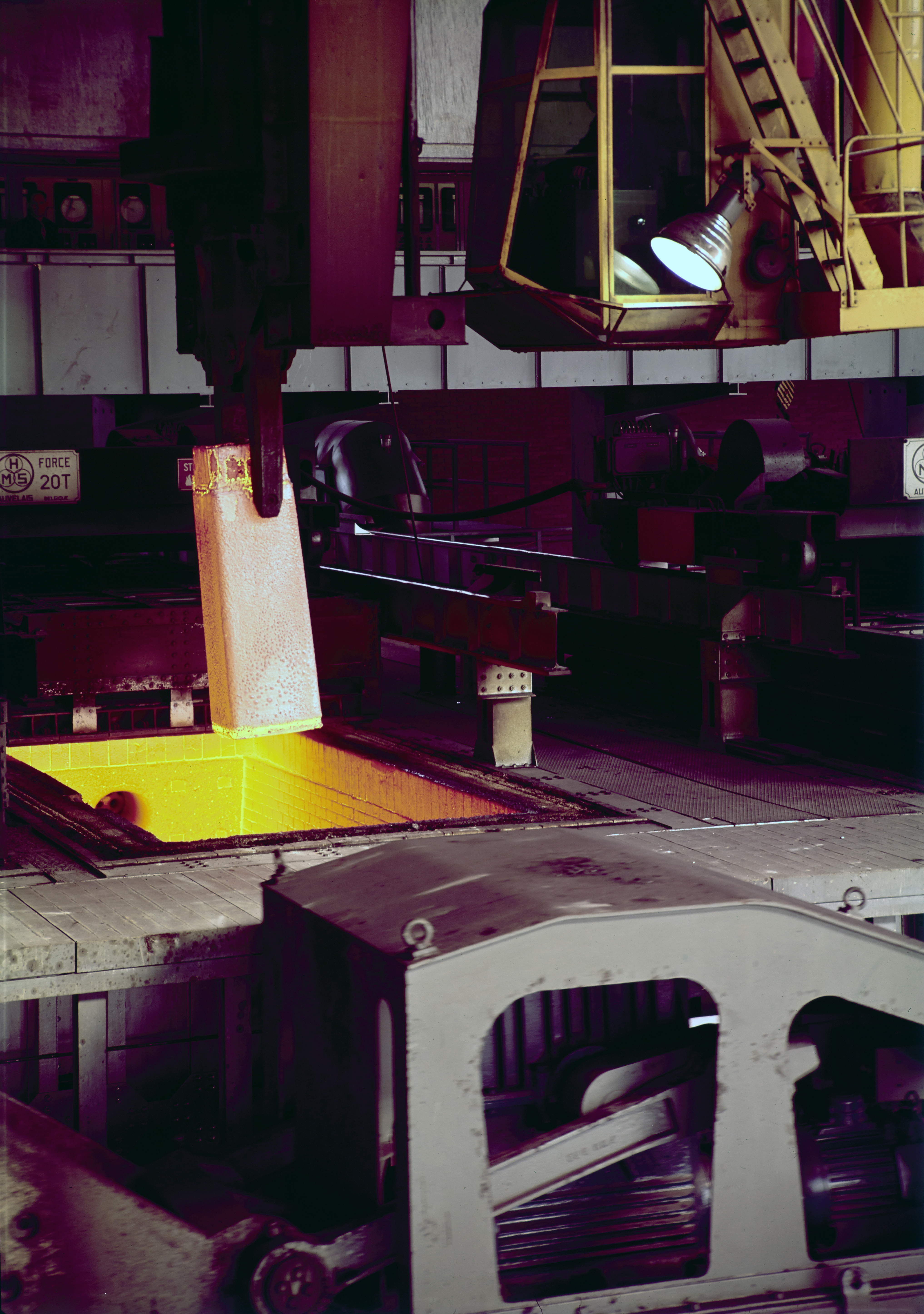 Kraan 105 haalt een blok uit putoven 7. Op de voorgrond zien we de automatische blokwagen staan welke het blok naar de blokwals zal gaan vervoeren.