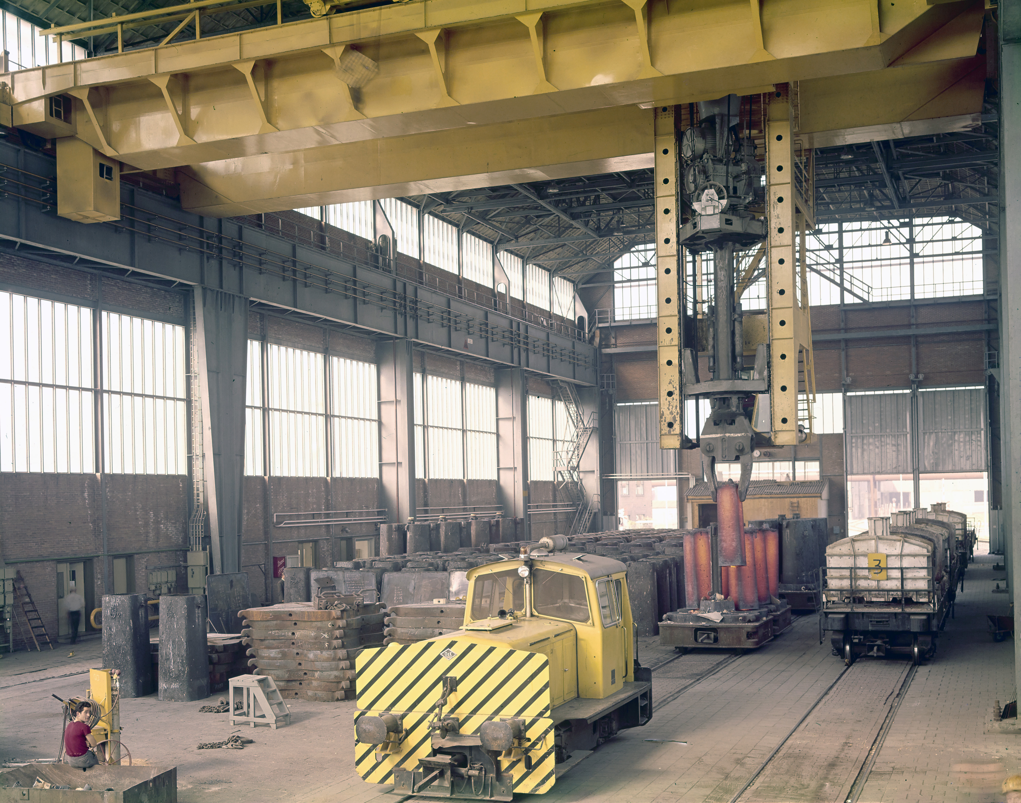 - Het laden van warmhoudwagons met getrokken blokken op weg naar de blokwalserij in de kabelfabriek in Alblasserdam.