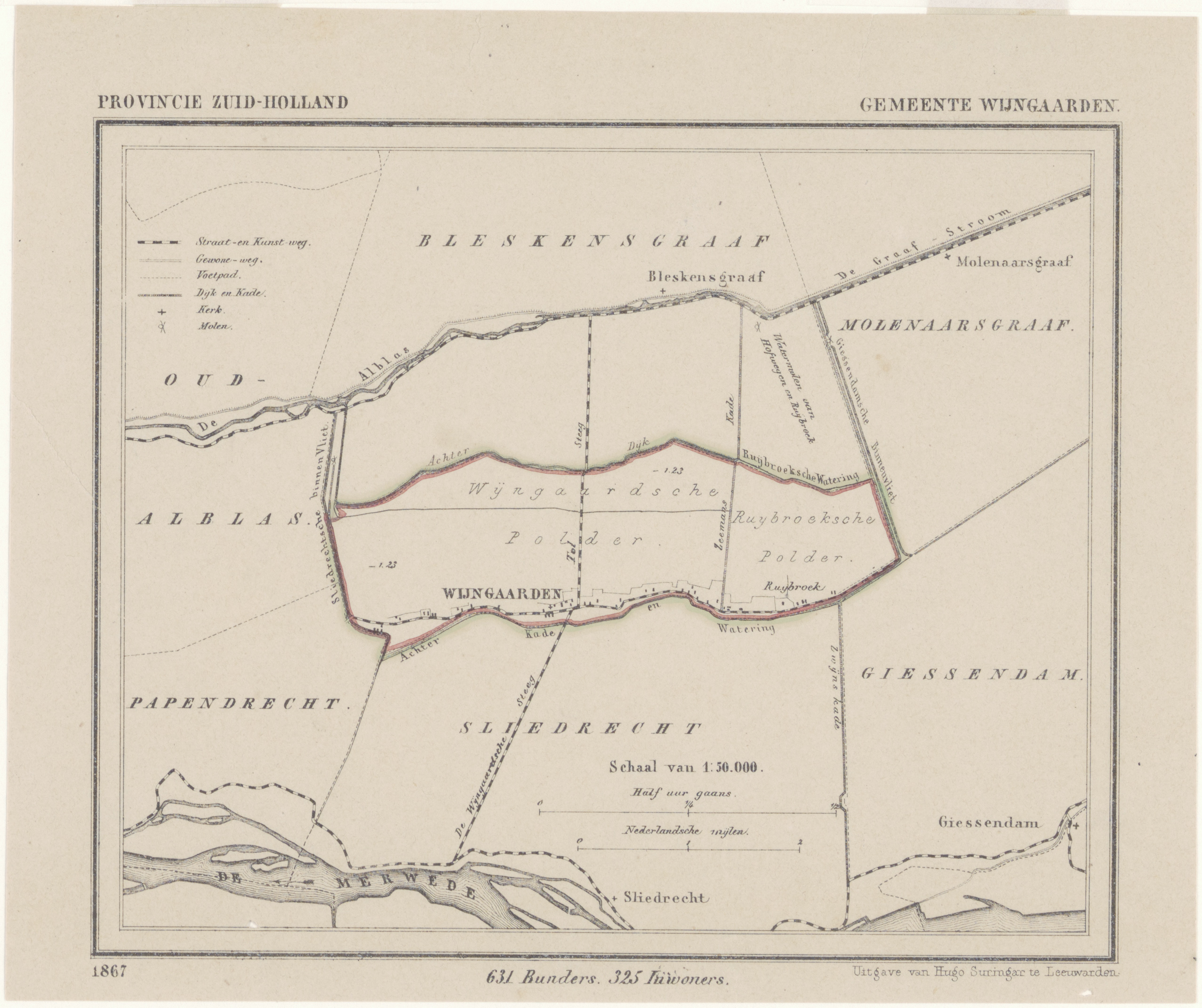 Oude kaart van de gemeente Wijngaarden getekend J.Kuyper 1867.