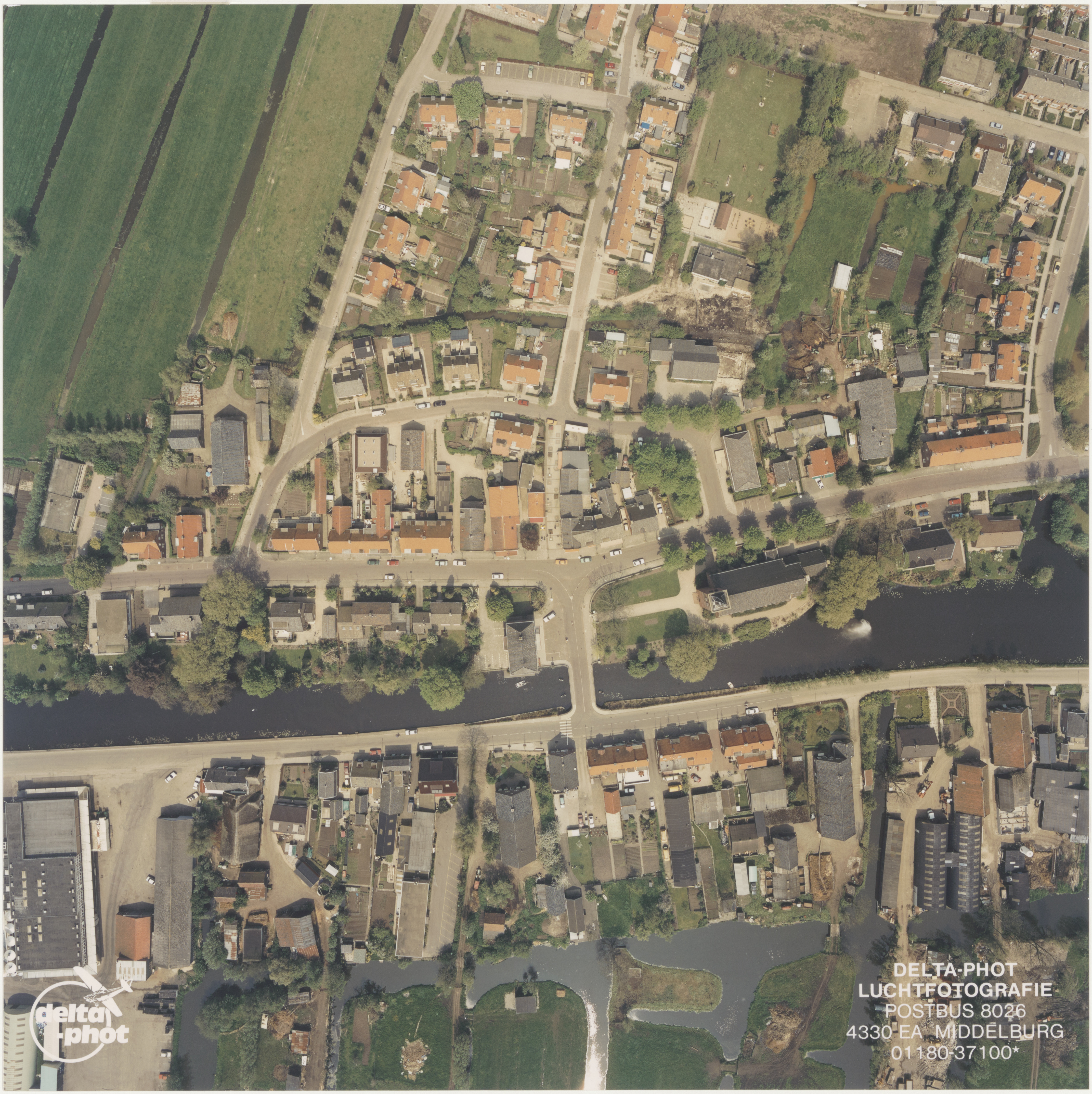 Luchtfoto Bleskensgraaf met links onder zuivelfabriek De Graafstroom aan de Dorpsstraat met de Graafstroom er boven. Midden naar boven de Graafstroomstraat. Midden links naar rechts Heulenslag/Kerkstraat.