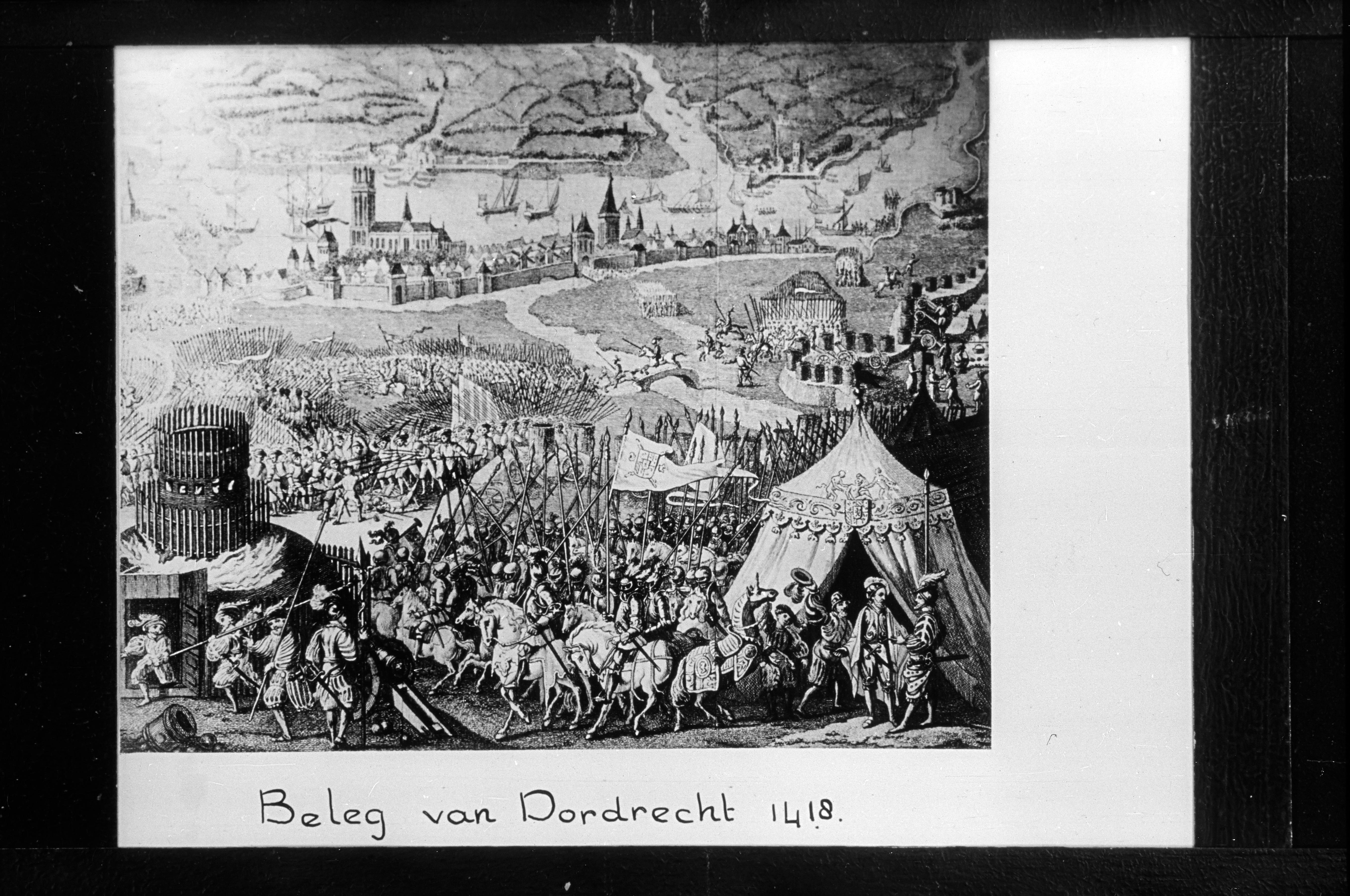 - 8 augustus 1418, het beleg van Dordrecht door Jan van Brabant. Gezicht op Dordrecht aan de landzijde bij vogelvlucht. Links vooraan staat een brandend aanvalswerk, in het midden rukken ruiters op naar de stad. Aan de rechterkant is Hertog Jan te zien voor een veldtent. Bovenaan de wapens van Dordrecht en Beieren.