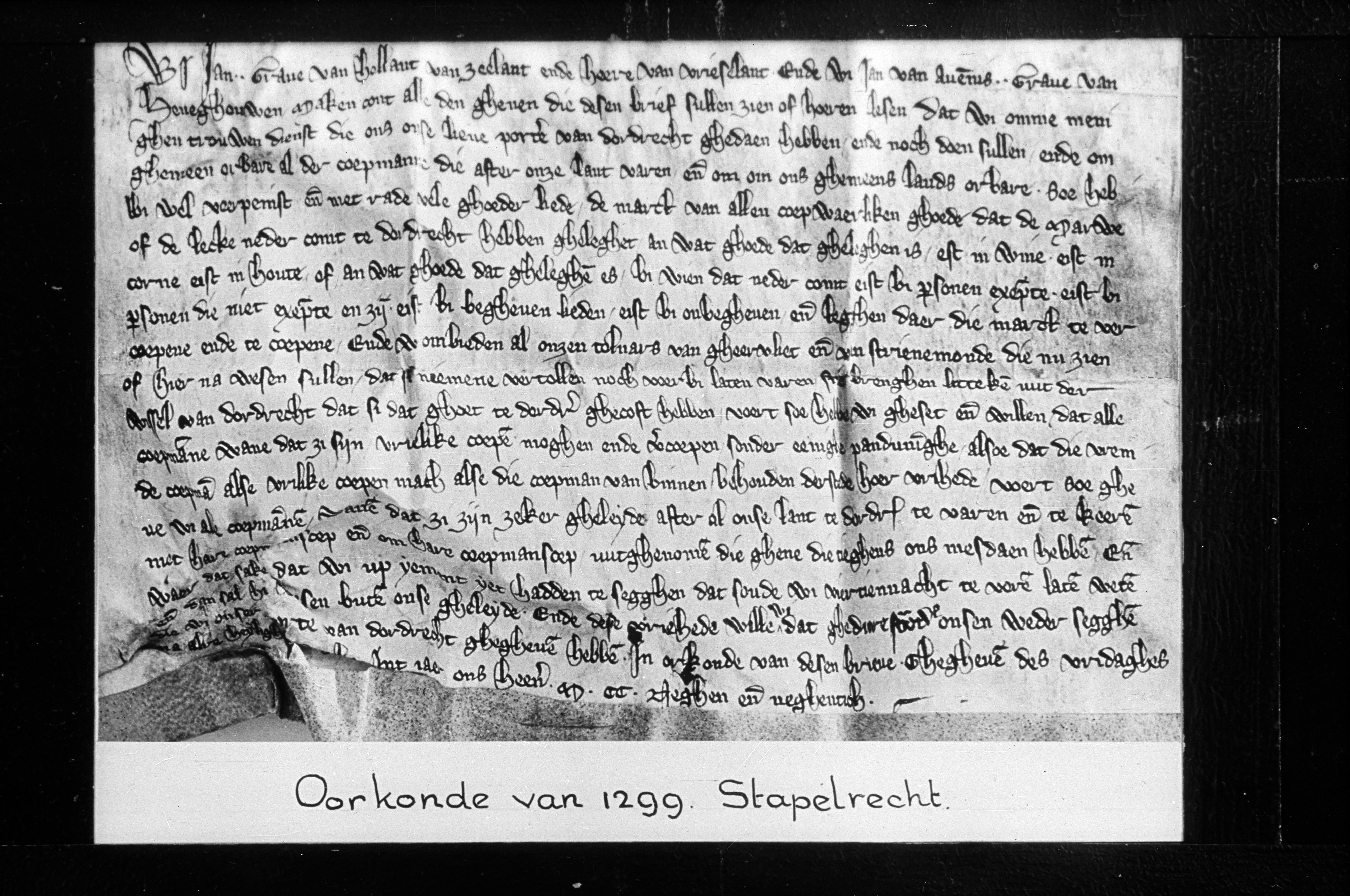 - Oorkonde uit 1299 verband houdende met het Stapelrecht in Dordrecht.