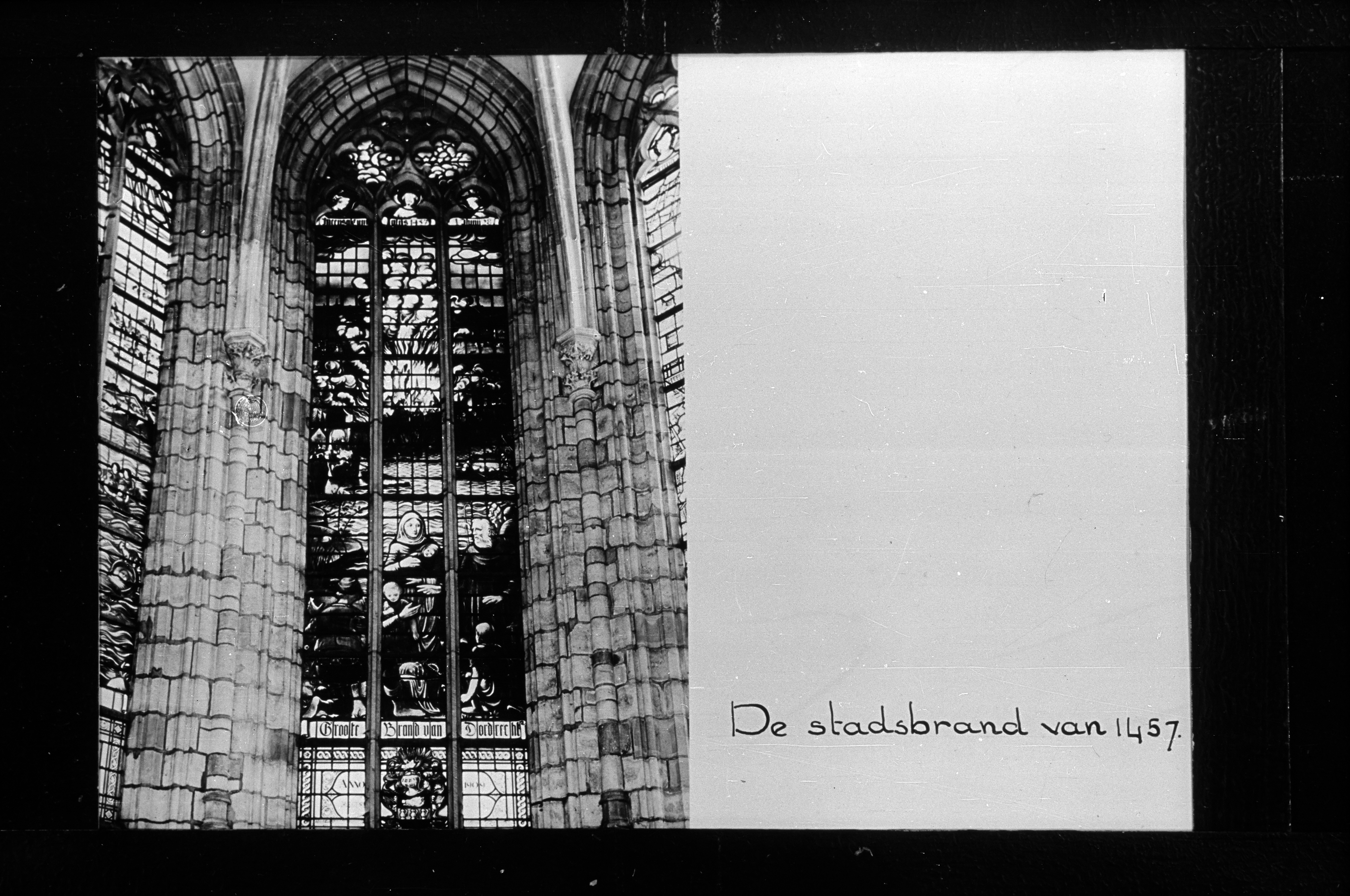 Gebrandschilderd raam in de Grote Kerk, voorstellende de stadsbrand in 1457.