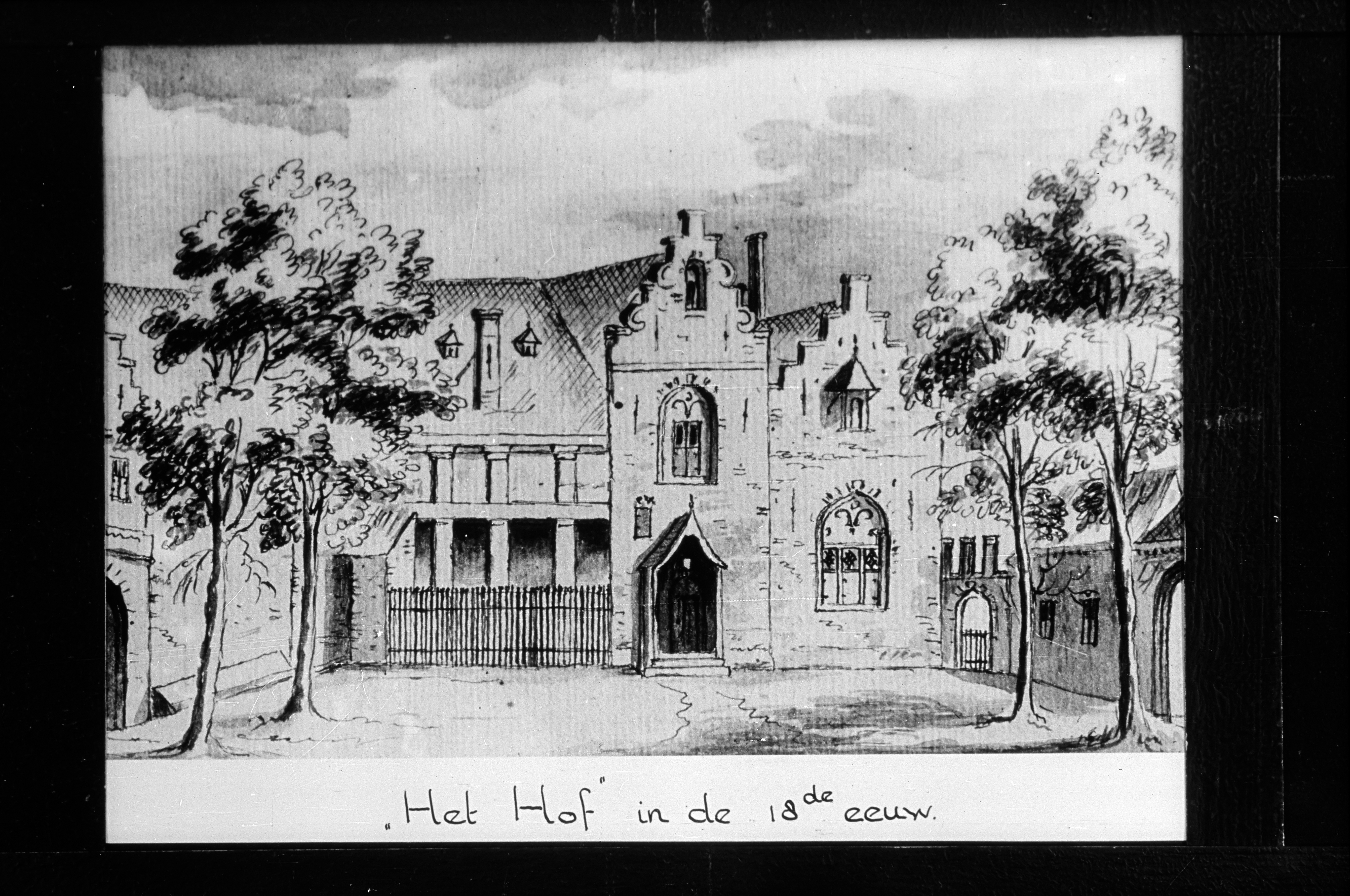 - Tekening van het Hof door A. Schoenmaker, met zicht op de Statenzaal.