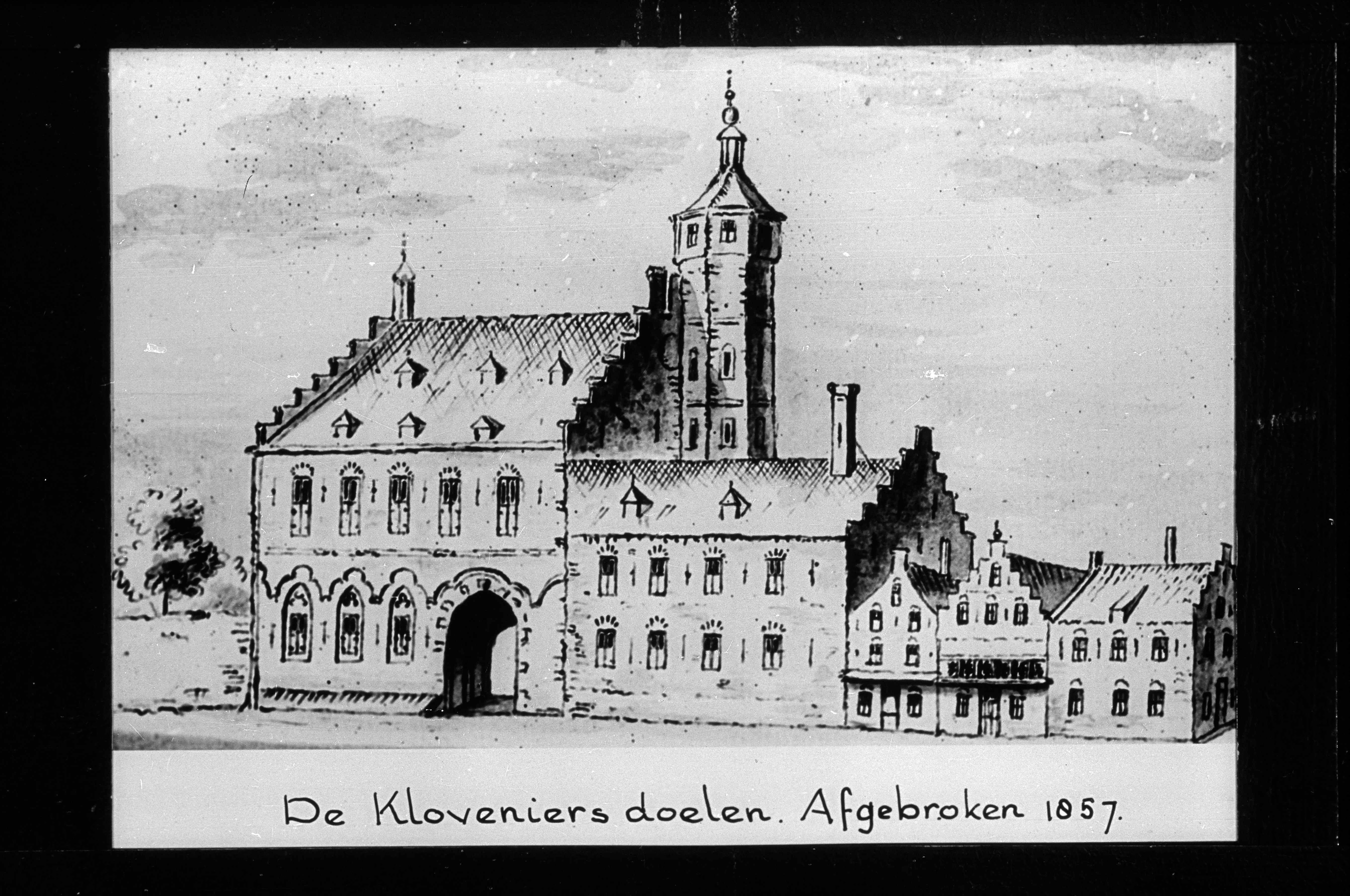 - Tekening in Oost-Indische inkt door E.H. Schoemaker (1987) van de Kloveniersdoelen aan de zijde van de Doelstraat met de zgn. "Draaiom", een tafel boven in de torenkamer die kon draaien. Gesloopt in 1857.