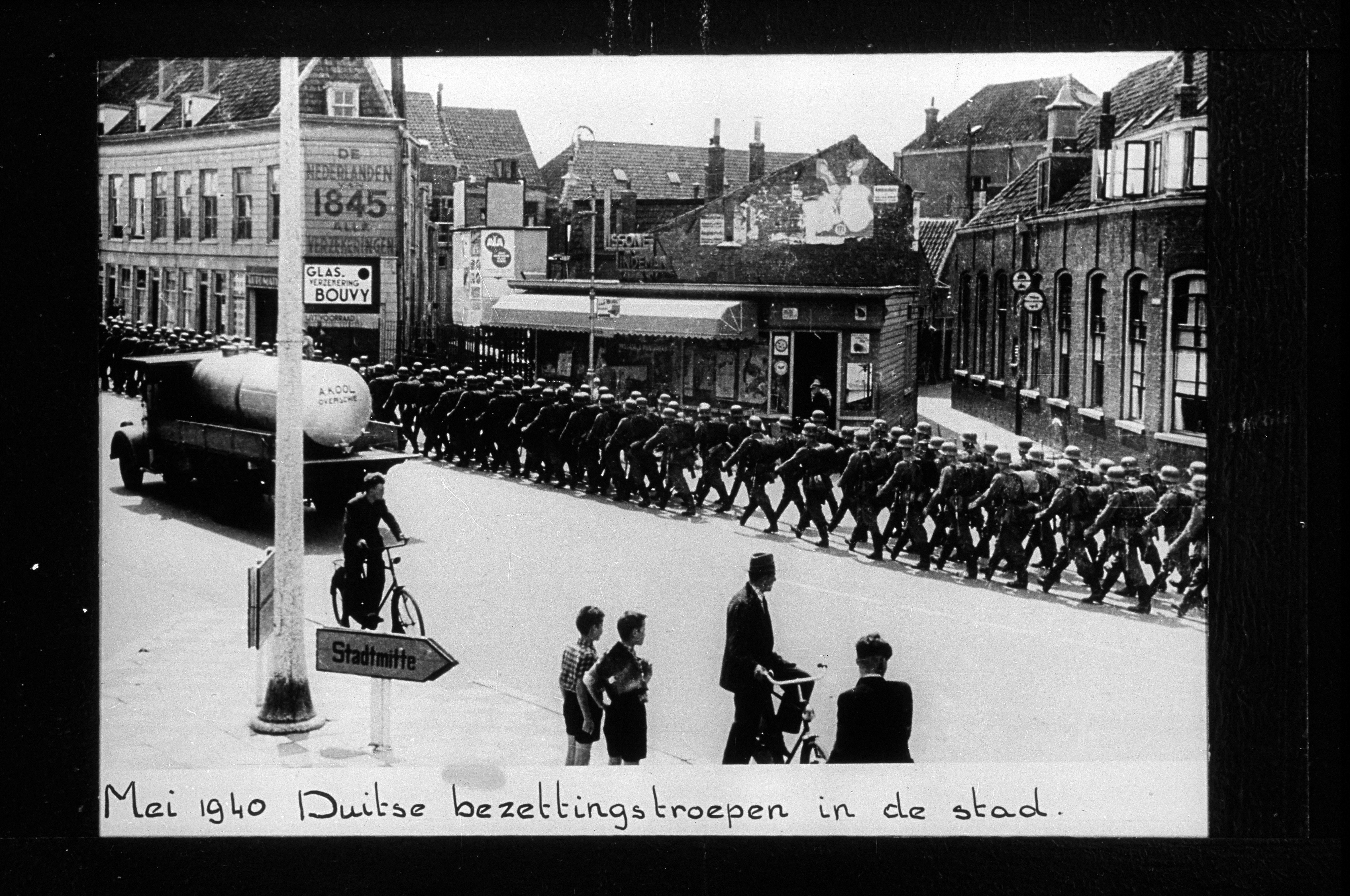 - Duitse militairen marcheren van het Bagijnhof naar de Johan de Wittstraat. Rechts het Achterom met het bestedelingenhuis, mdden reisbureau Lissone Lindeman.