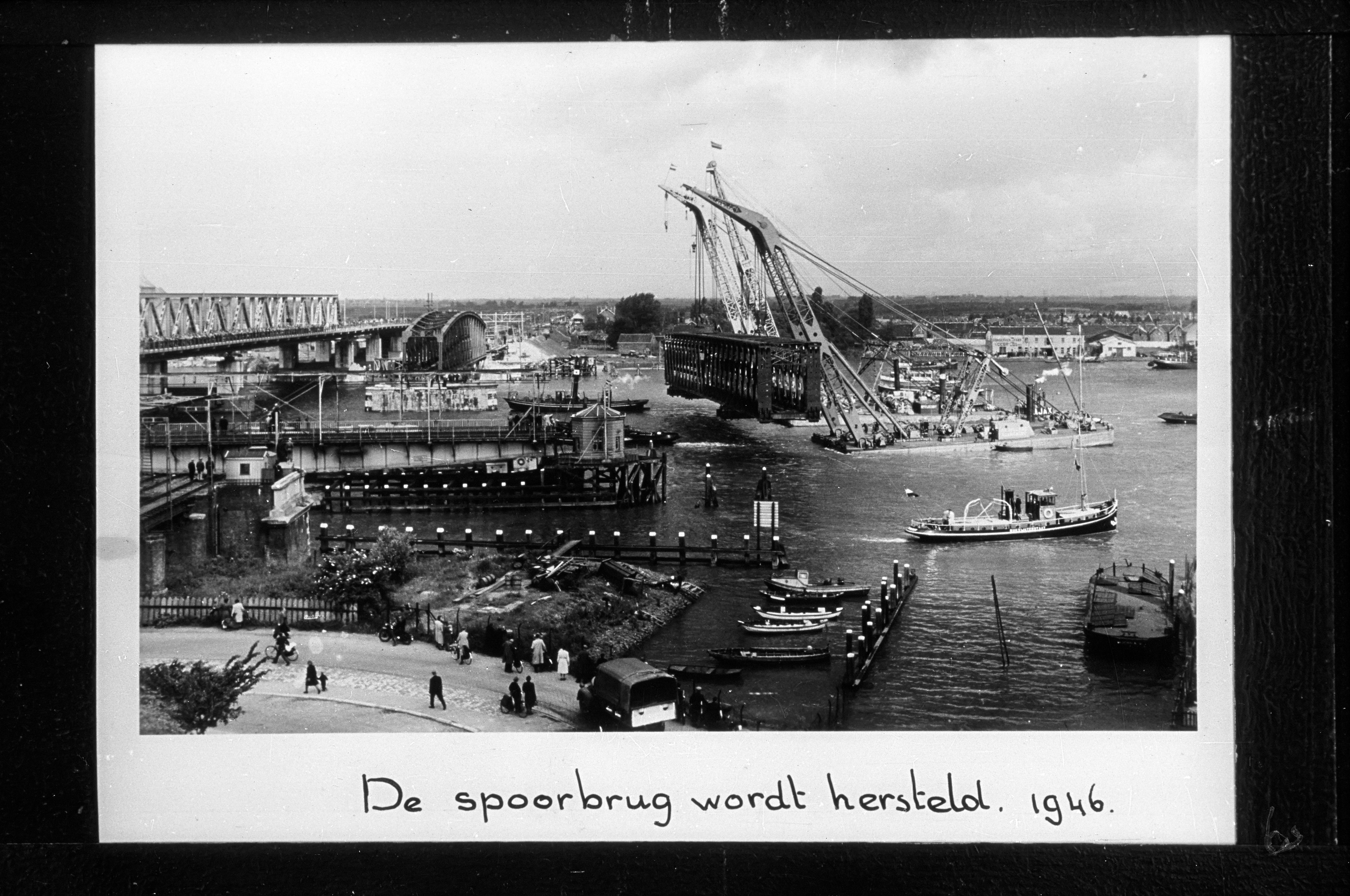 Herstel van de oorlogsschade aan de spoorbrug over de Oude Maas, gezien vanaf de Dokweg richting Zwijndrecht.