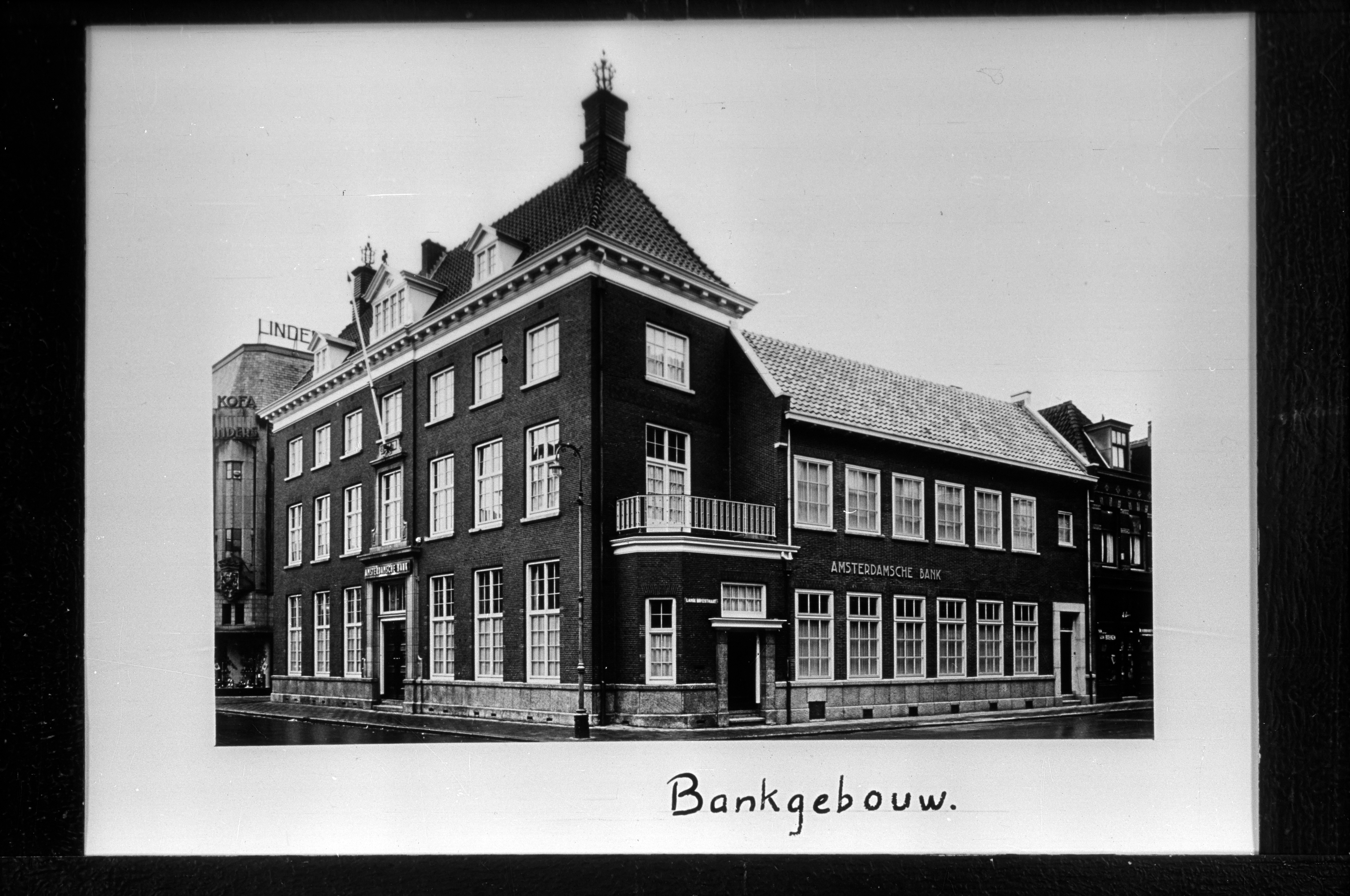 - De Amsterdamse Bank op het Bagijnhof, hoek Lange Breestraat. Geheel links warenhuis Linders.