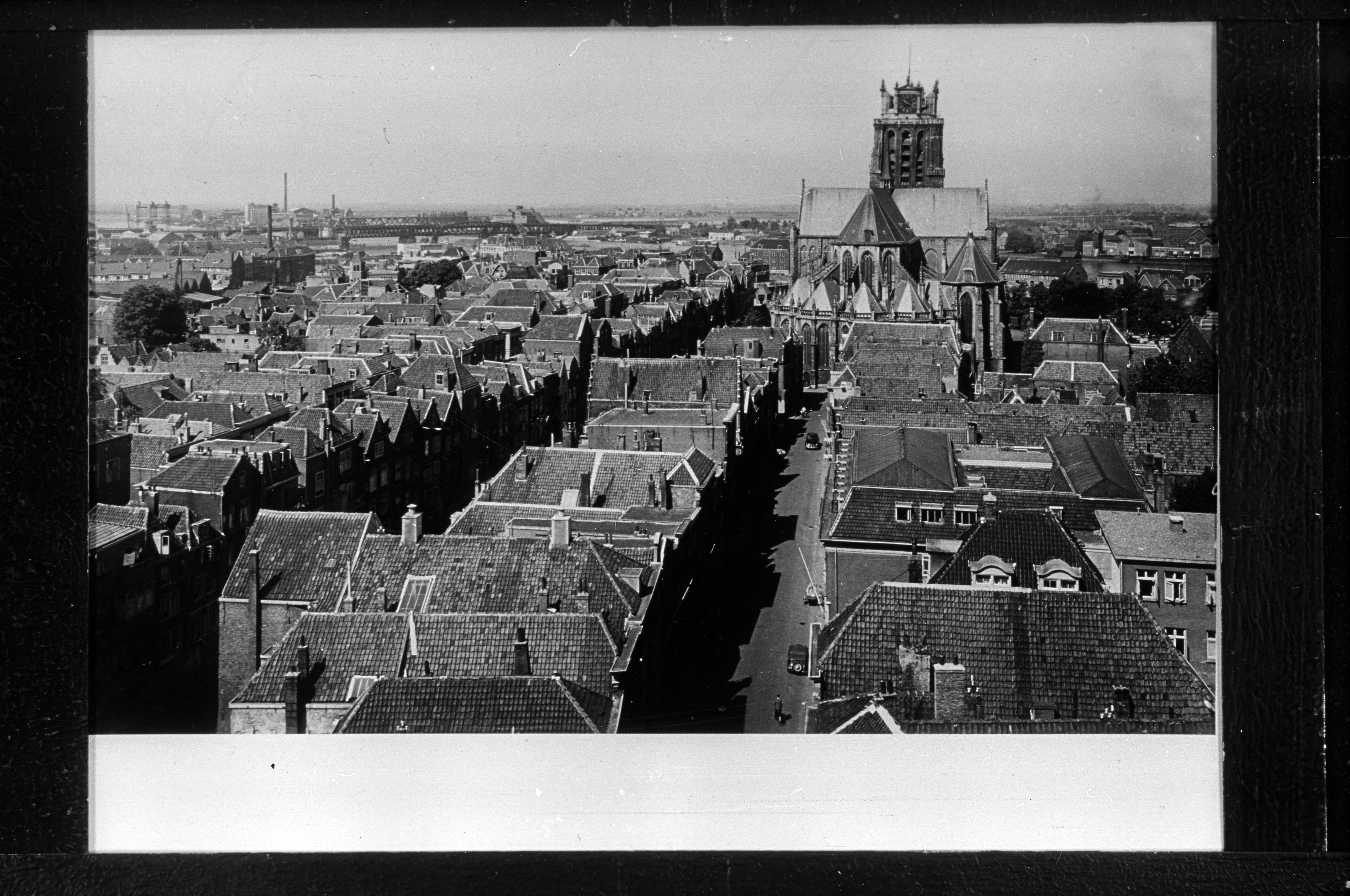 Panorama vanaf het stadhuis naar het westen: door de Grotekerksbuurt naar de Grote Kerk. De linker rij huizen wordt gevormd door de Voorstraat.