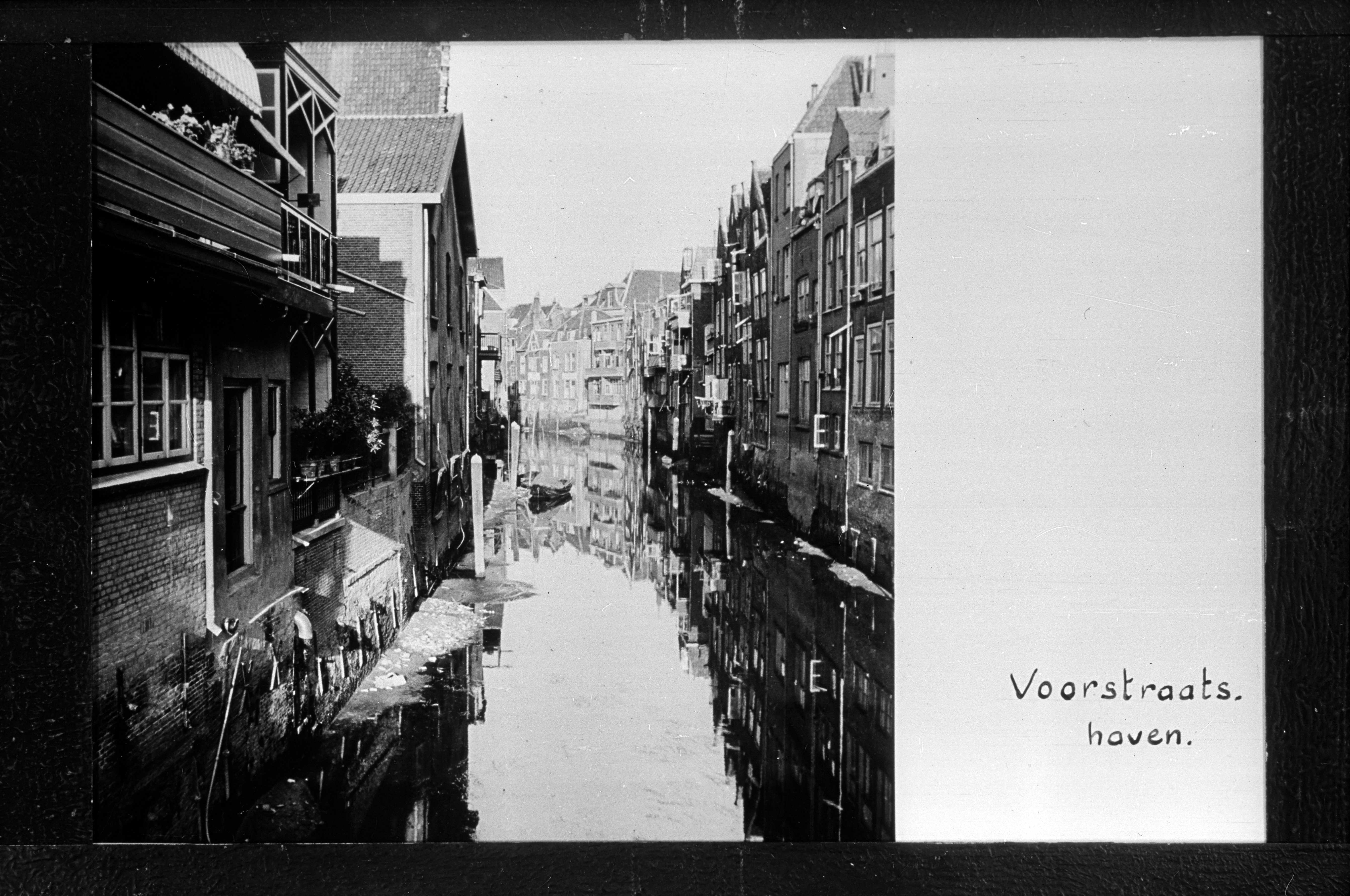 - Voorstraatshaven vanaf Pelserbrug richting Lombardbrug gezien. Links de Grotekerksbuurt, rechts de Voorstraat.