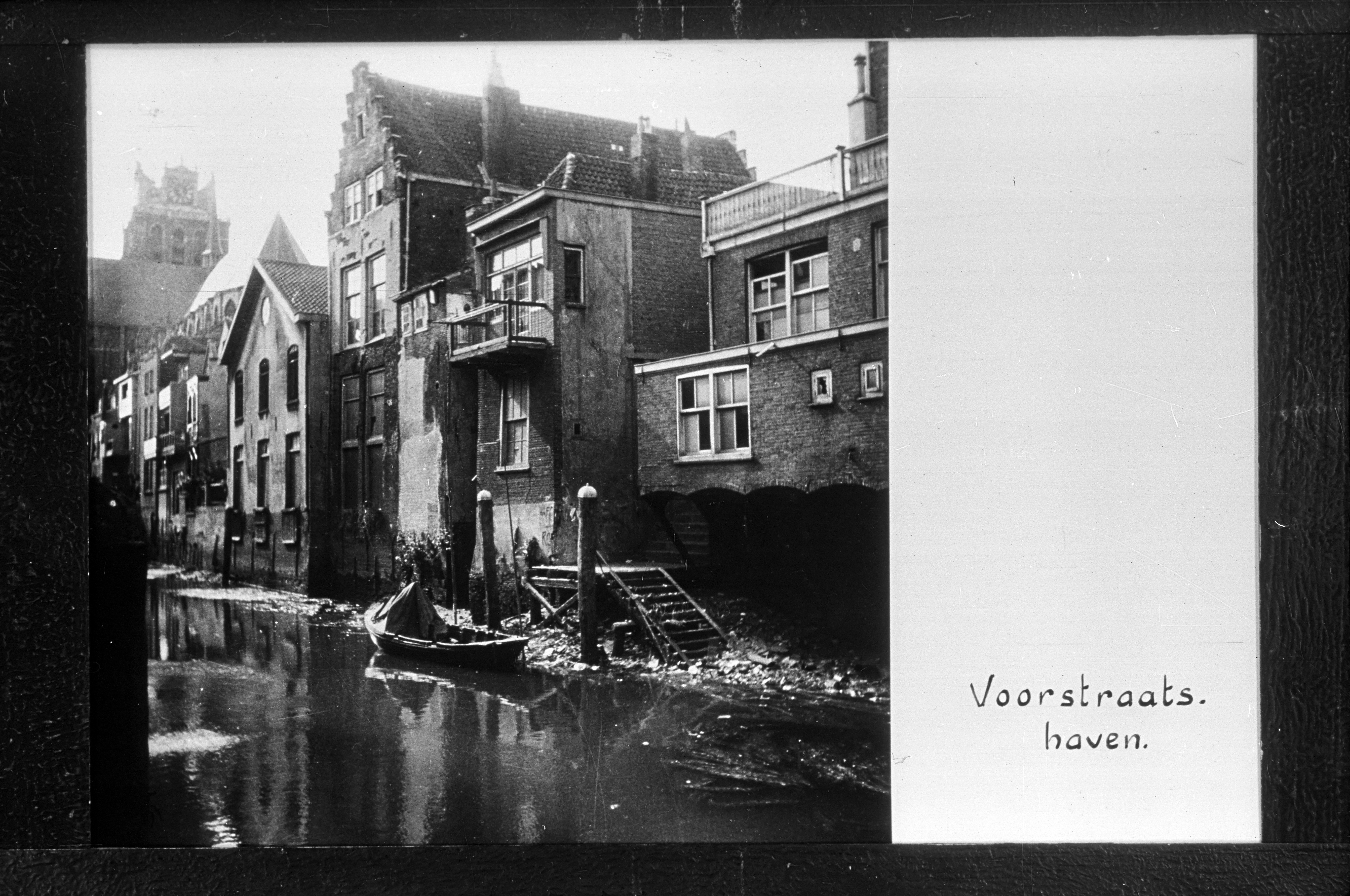 - Voorstraatshaven vanaf een punt tussen Botgenssteiger en Pelserbrug in de richting van de Grote Kerk.
