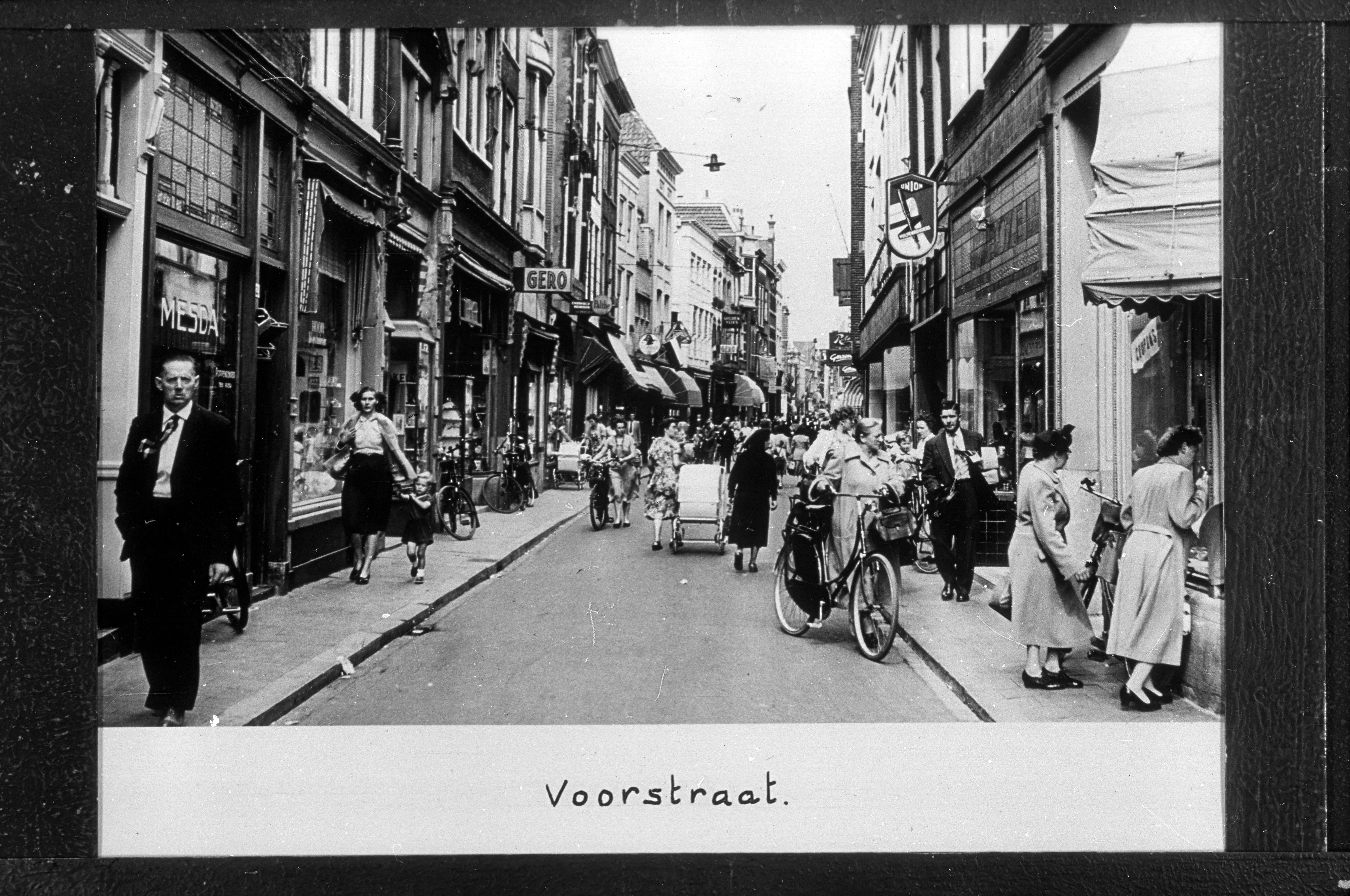 De Voorstraat vanaf de Visbrug richting het Scheffersplein. Links vooraan speelgoedhandel Mesda, verderop Tupker voor glas- en serviesgoed.