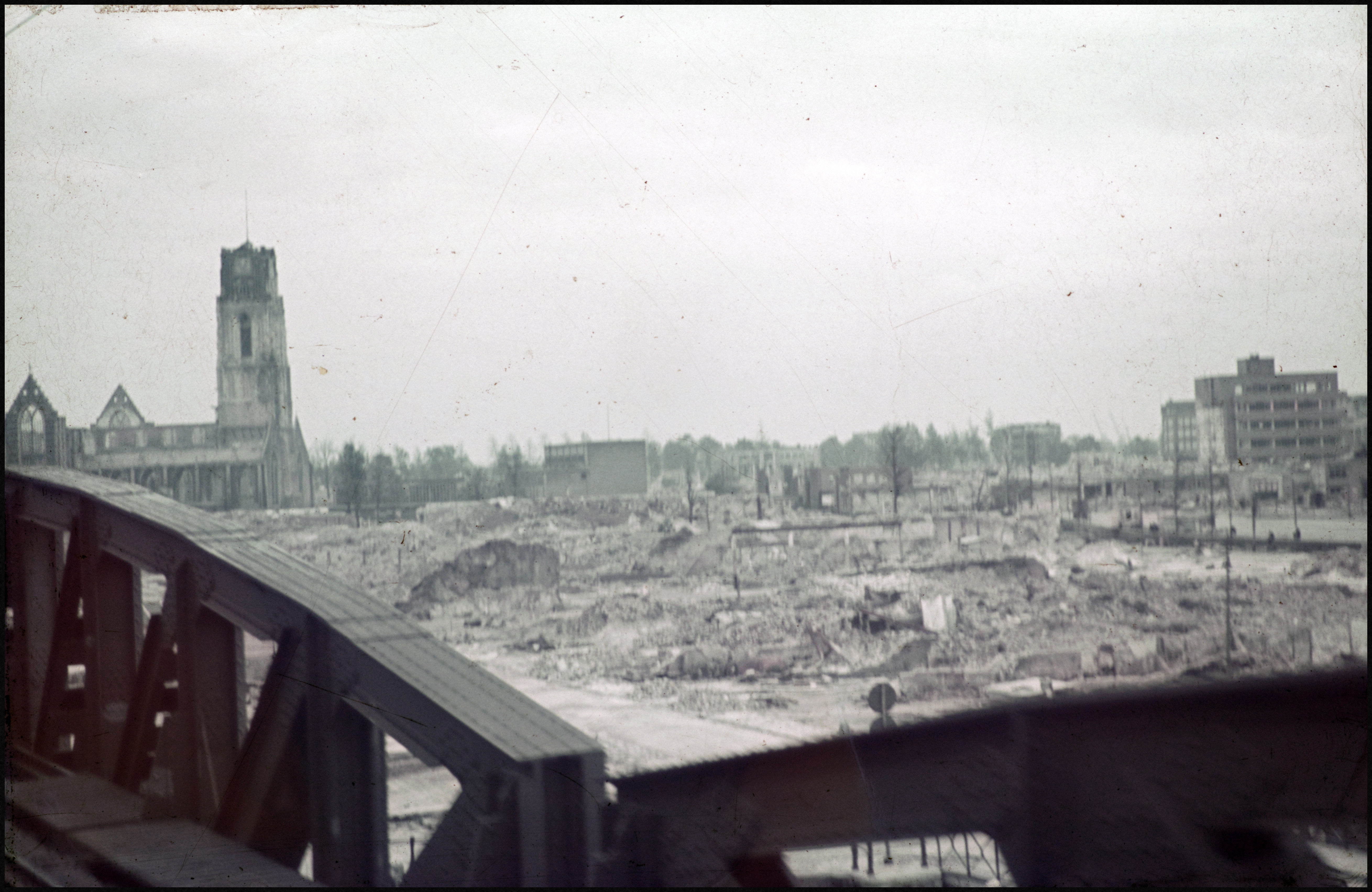 - Verwoest gedeelte van Rotterdam door het bombardement op 14 mei 1940, gezien vanaf de spoorweg bij station Blaak. Links de Sint Laurenskerk.