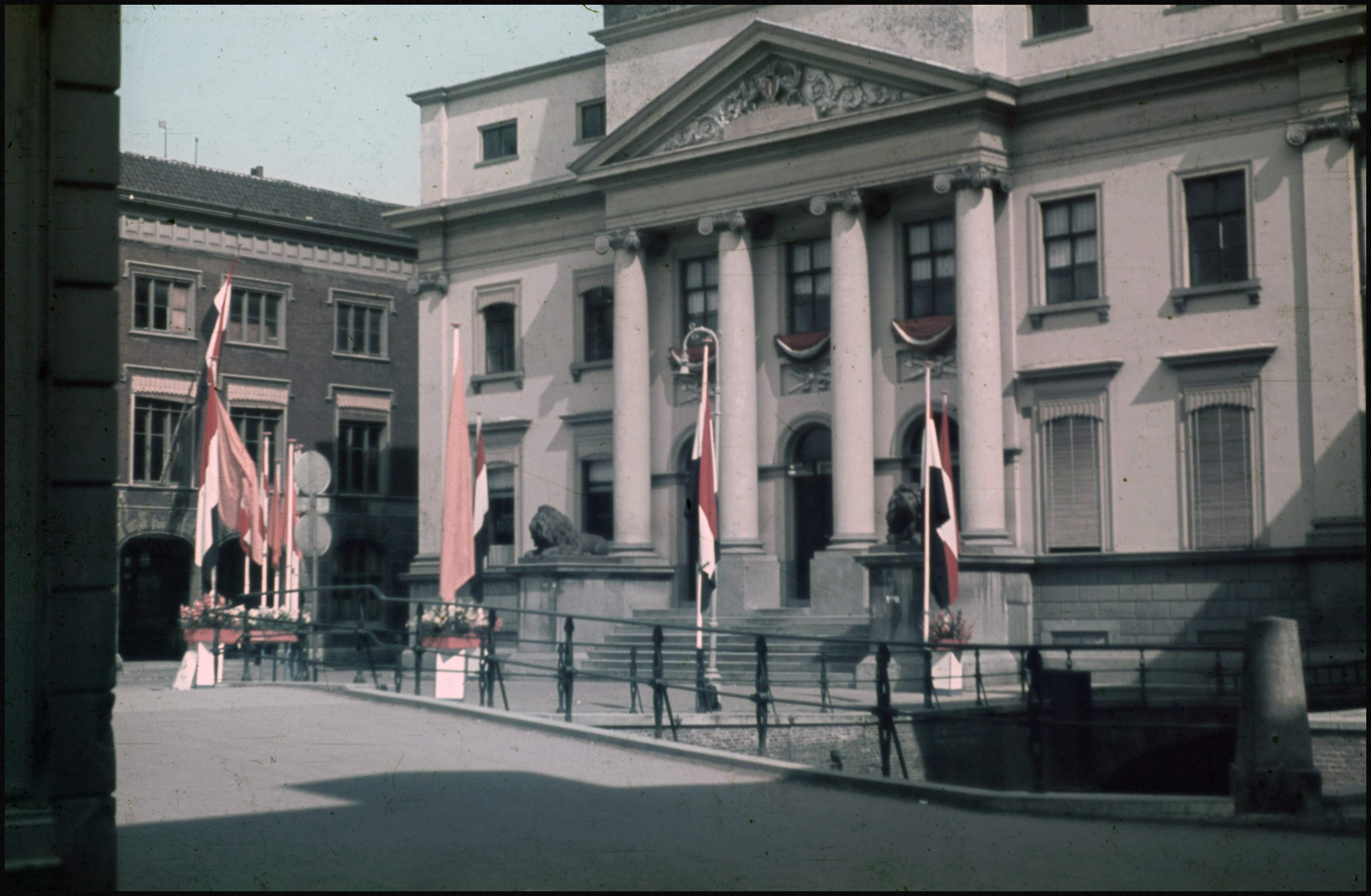 Vanaf de Voorstraat over de Lombardbrug vlagvertoon voor het stadhuis bij een onbekende gelegenheid. Links het hoofdbureau van politie op de Groenmarkt.