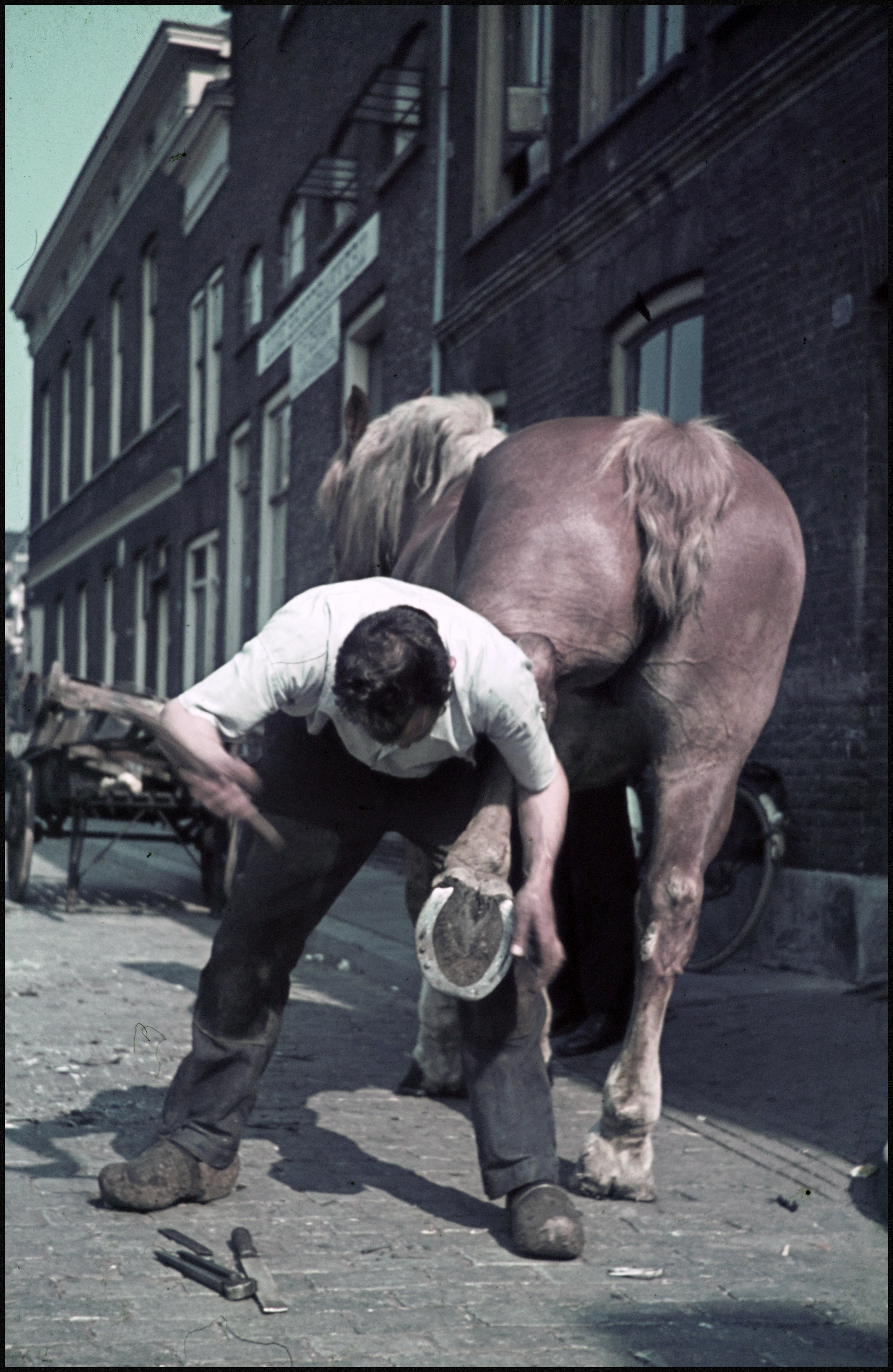 Hoefsmid Teun van de Ham, het pand met het witte opschrift is de brood-en banketbakkerij van T.F. Oskam, aansluitend het woonhuis en op het Spuiplein de winkel van Oskam, dit was vroeger (voor 1935) de beschuitfabriek van Waardhuizen. (tussen het woonhuis en de bakkerij is nog een klein ingeklemd pandje dat door Oskam verhuurd werd, te klein voor een gezin).