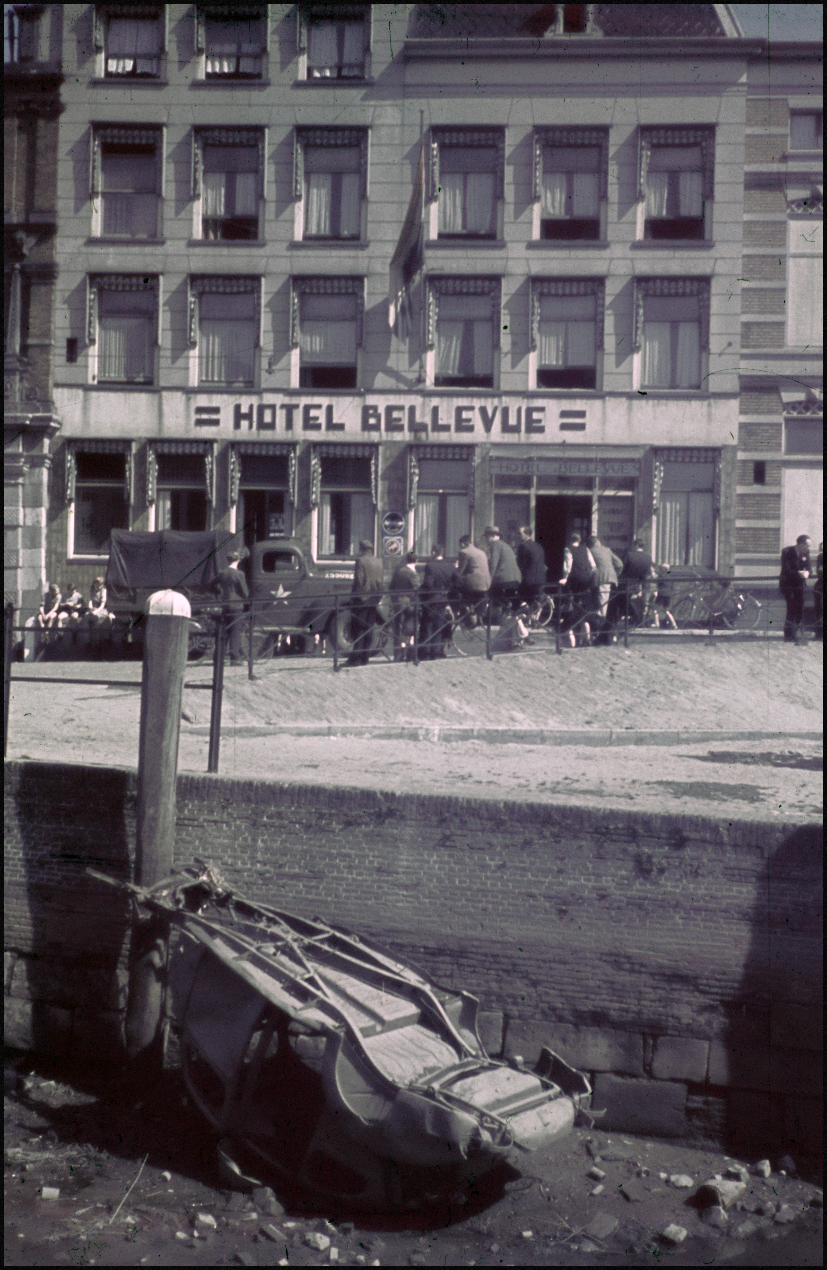 Autowrak bij het Gorcums Veerhoofd. De Nederlandse vlag wappert aan Hotel Bellevue.