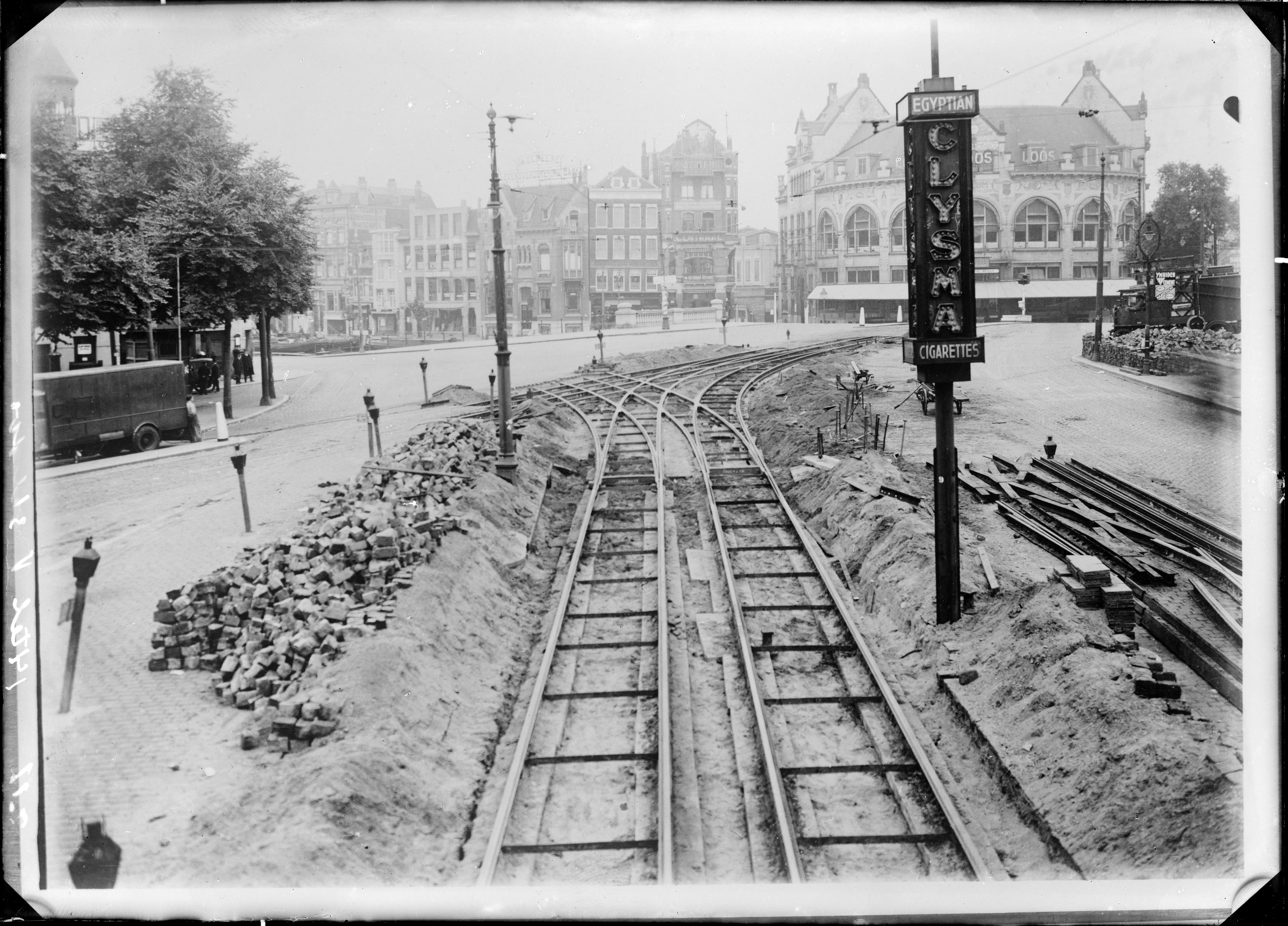 - Aanleg van tramrails in het wegdek van het Hofplein en de Coolsingel in Rotterdam. Midden op de achtergrond het treinstation van de Hofpleinlijn.