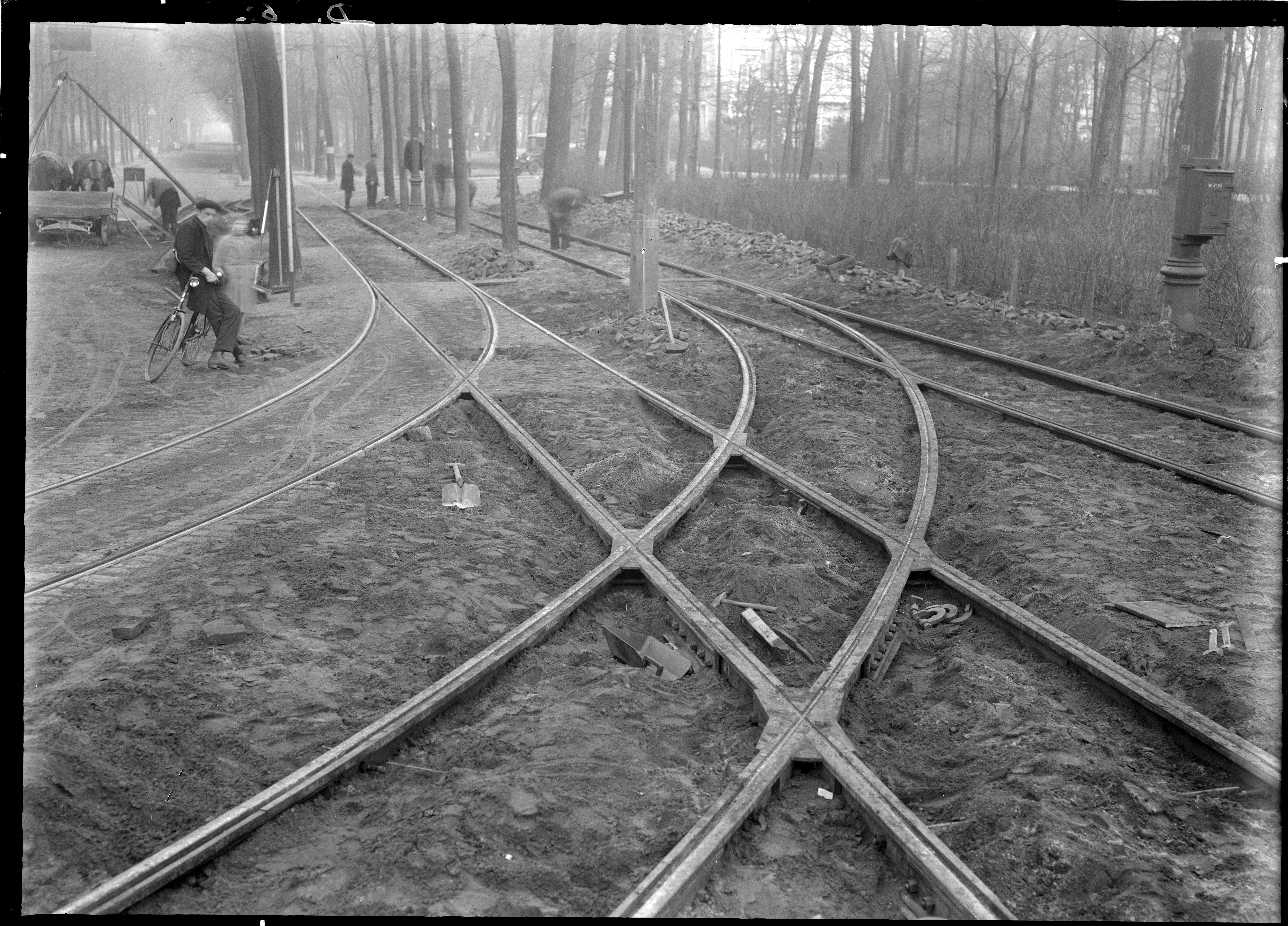 - Aanleg van de trambaan, ook wel de Bollentram genoemd, aan de Dreef in Haarlem, gezien naar het noorden. Rechts door de bomen het provinciehuis Paviljoen Welgelegen.