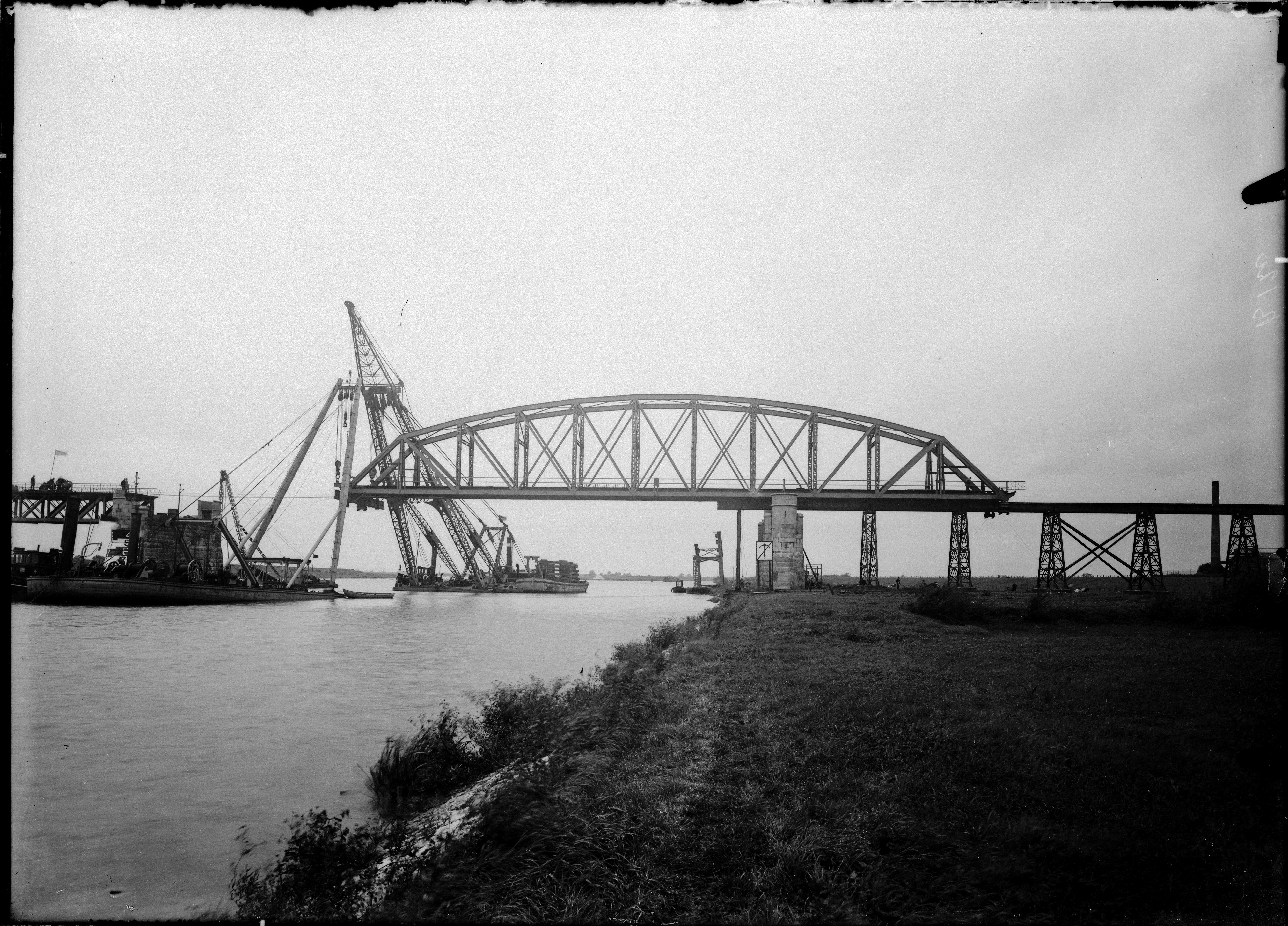 Bouw van een spoorbrug over de Maas in Mook.