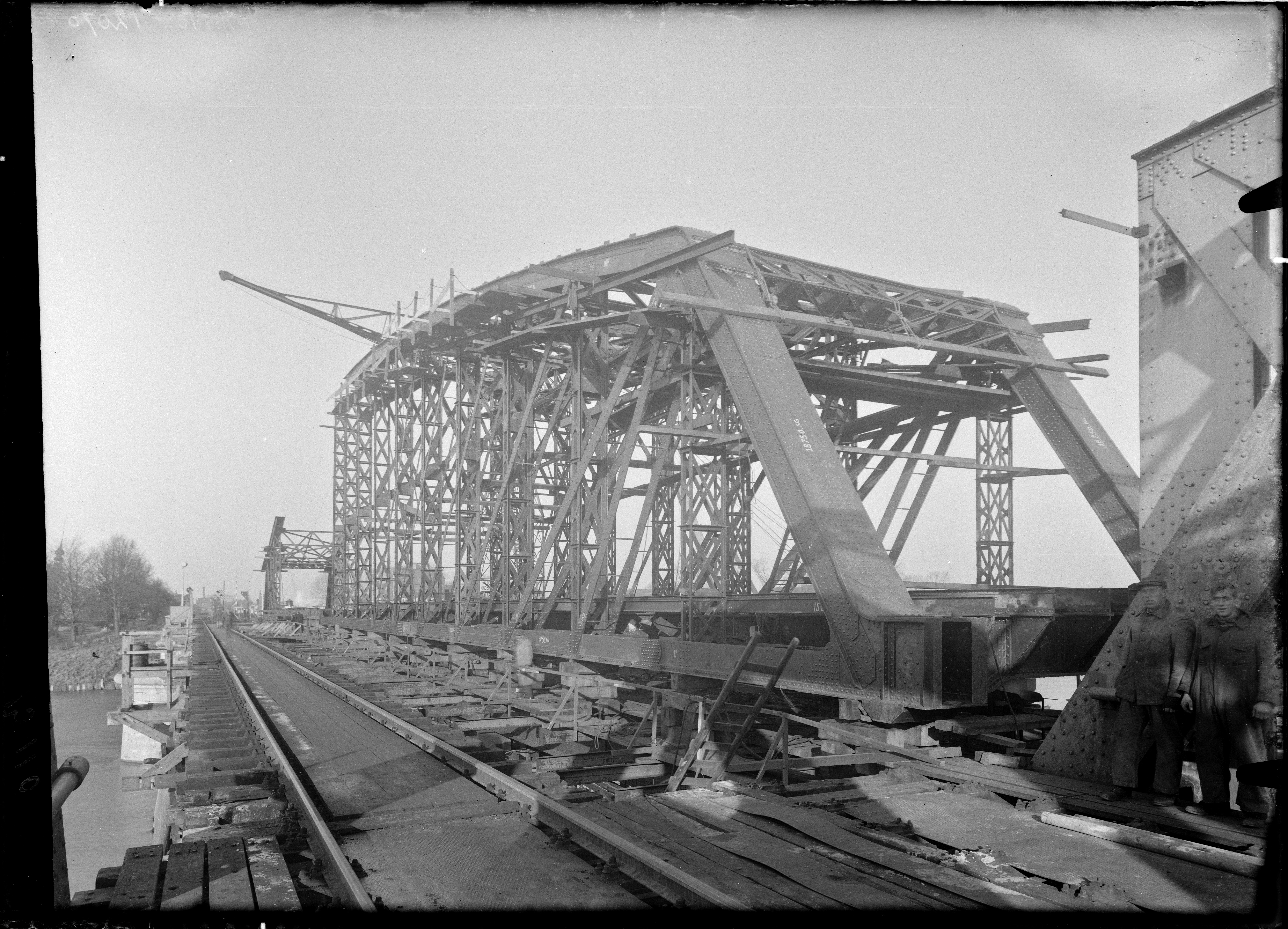 Bouw van de spoorbrug over de Maas bij Venlo.